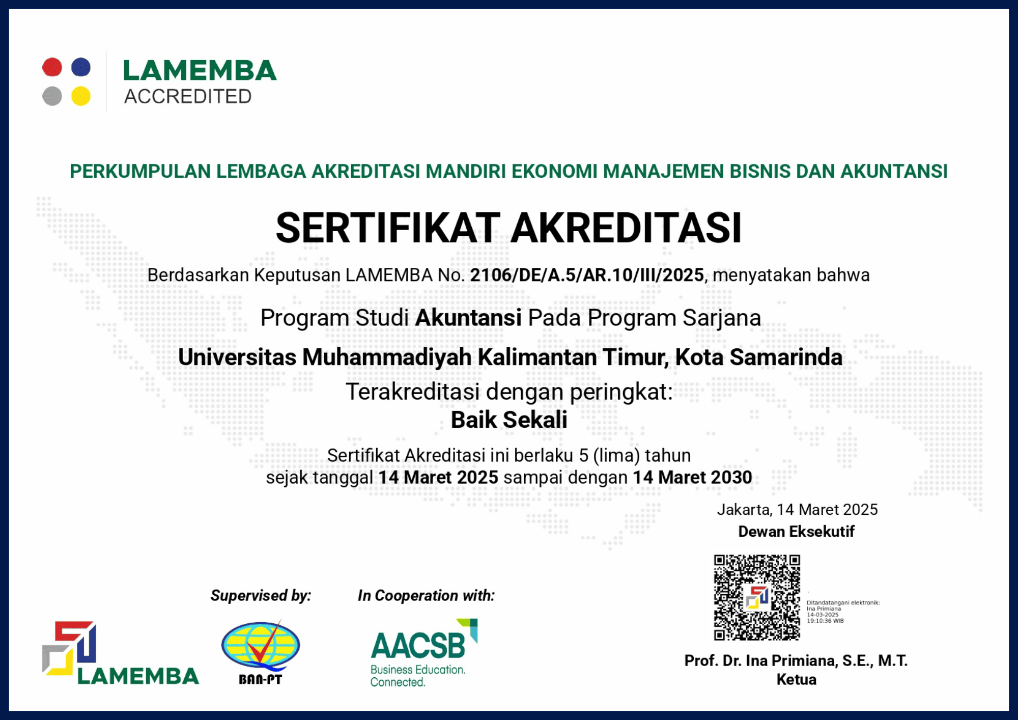 |  | | S1 Akuntansi Program Studi S1 Akuntansi Universitas Muhammadiyah Kalimantan Timur, Kota Samarinda, memperoleh peringkat akreditasi "Baik Sekali" dari Lembaga Akreditasi Mandiri Ekonomi Manajemen Bisnis dan Akuntansi (LAMEMBA). Sertifikat akreditasi ini berlaku selama 5 (lima) tahun berdasarkan Keputusan LAMEMBA No. 2106/DE/A.5/AR.10/III/2025, mulai dari tanggal 14 Maret 2025 hingga 14 Maret 2030. |