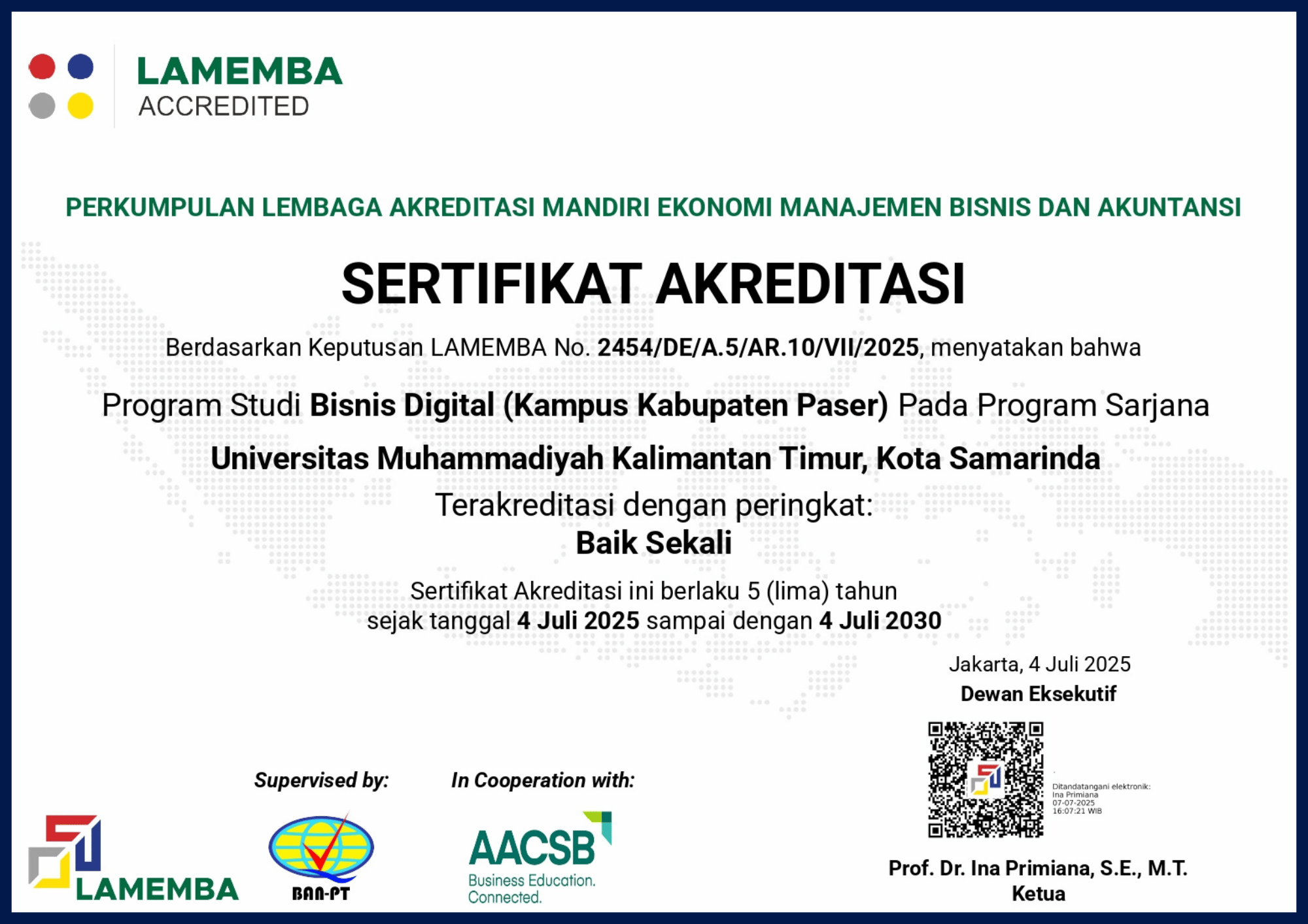 |  | | S1 Bisnis Digital Berdasarkan Keputusan LAMEMBA No. 2454/DE/A.5/AR.10/VII/2025, Program Studi S1 Bisnis Digital Universitas Muhammadiyah Kalimantan Timur (Kampus Kabupaten Paser) dinyatakan memenuhi syarat peringkat akreditasi "Baik Sakali". Keputusan ini berlaku selama 5 (Lima) tahun, sejak tanggal 4 Juli 2025 sampai dengan 4 Juli 2030. |
