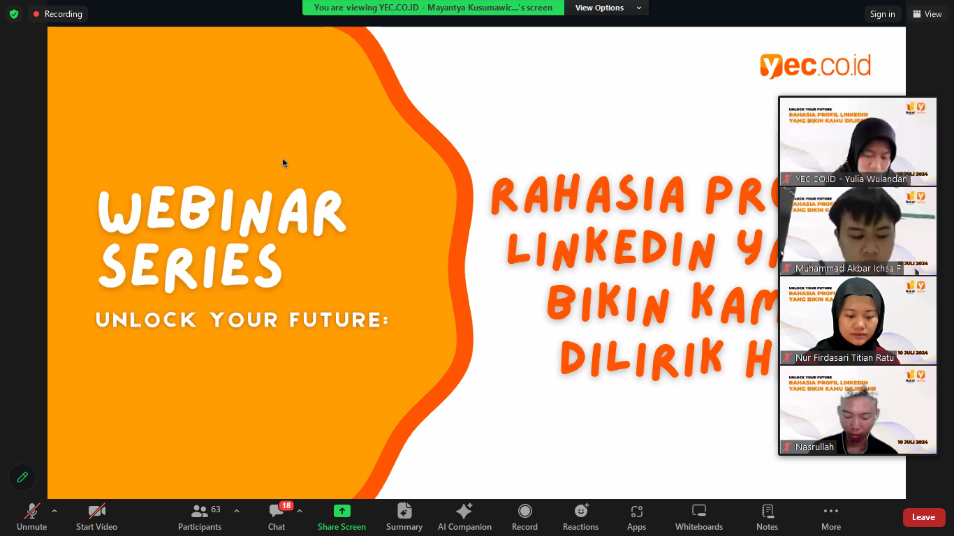Yec.co.id berkolaborasi dengan UMKT menggelar acara webinar Unlock Your Future #1 bertemakan " Rahasia Profil Likedln yang Bikin Kamu Dilirik HR". Topic pembicaraan pada kegiatan ini membahas mengenai seberapa berpengaruhnya Linkedln dalam pengembangan relasi dan karir.