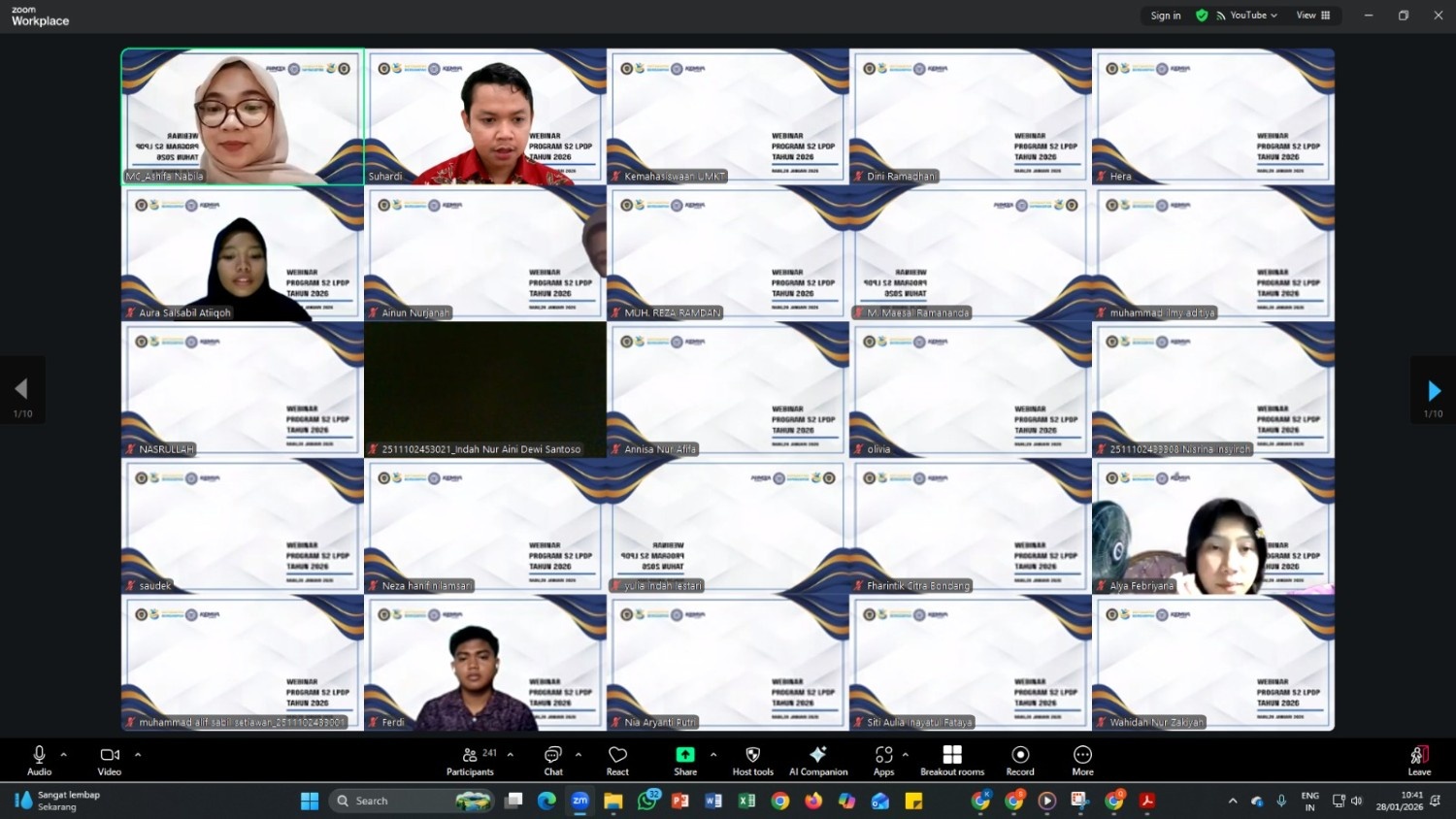 Samarinda 28 Januari 2026 – Universitas Muhammadiyah Kalimantan Timur (UMKT) melalui bidang Kemahasiswaan kembali menunjukkan komitmennya dalam mendukung pengembangan kualitas sumber daya manusia. Kali ini, UMKT menggelar Webinar Online bertajuk Program S2 Beasiswa LPDP Tahun 2026, sebuah kegiatan yang menjadi magnet bagi ratusan mahasiswa dari berbagai fakultas.