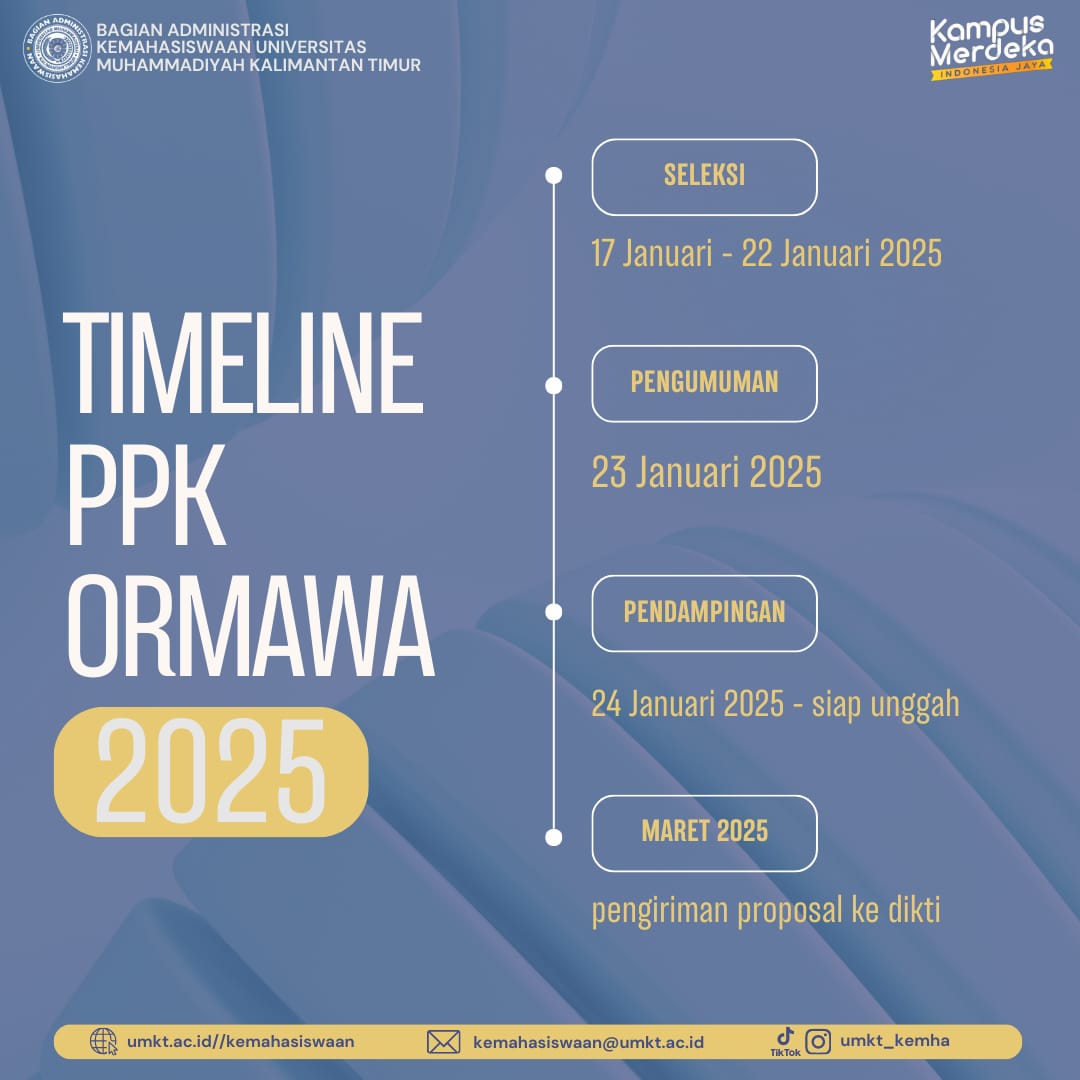 Samarinda, 28 November 2024 - Universitas Muhammadiyah Kalimantan Timur (UMKT) kembali membuka Pendaftaran Program Peningkatan Kapasitas Organisasi Kemahasiswaan (PPK Ormawa) untuk tahun 2024-2025. Program ini dirancang untuk meningkatkan kapasitas mahasiswa melalui organisasi kemahasiswaan (Ormawa) yang berperan sebagai motor penggerak perubahan di lingkungan kampus dan masyarakat.