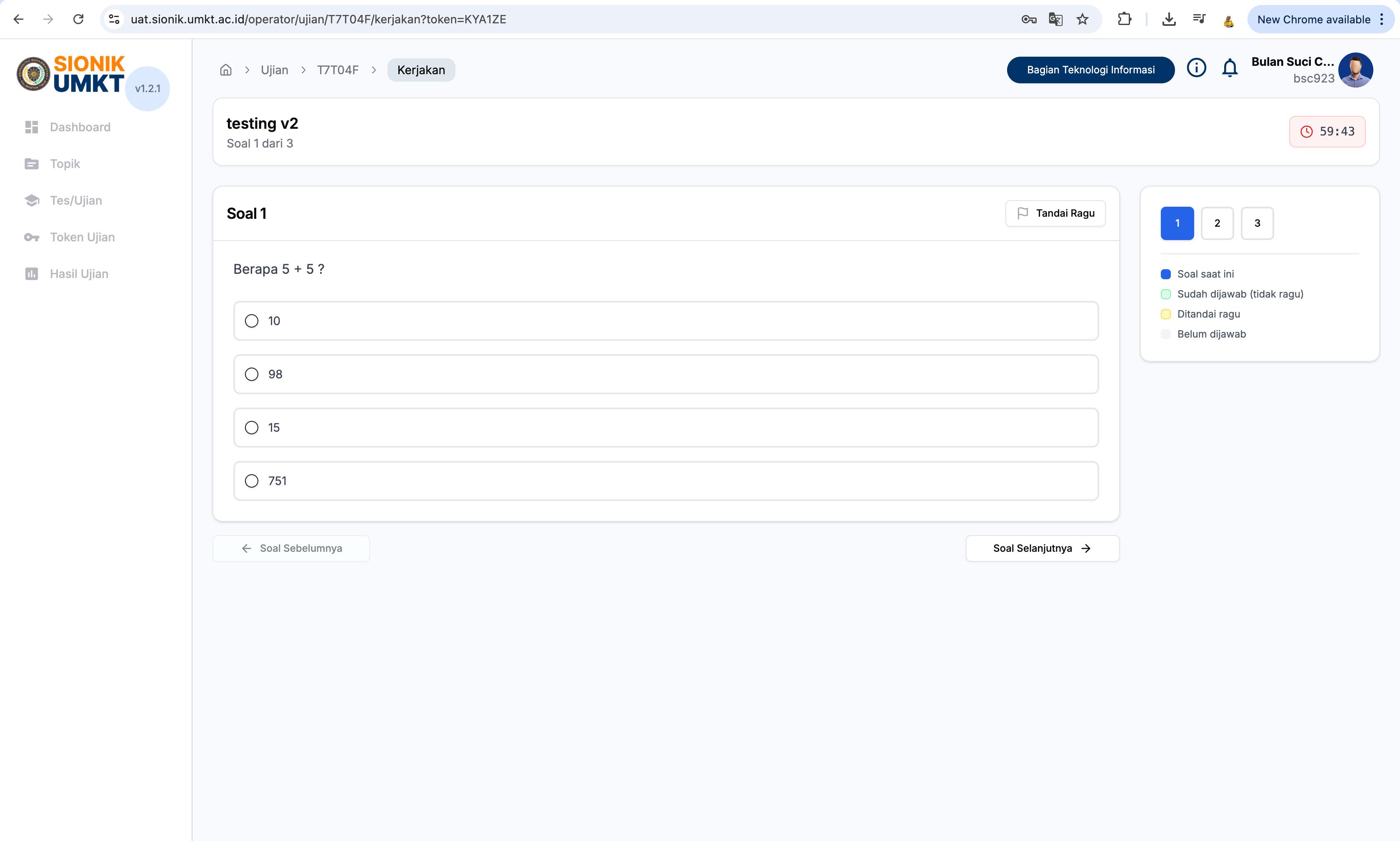 Keunggulan utama SIONIK terletak pada keamanannya yang terjamin, dilengkapi fitur yang meminimalisir potensi kecurangan online, sehingga integritas hasil ujian dapat terjaga. Selain itu, sistem ini sangat efisien dalam waktu, memangkas birokrasi dan waktu tunggu, dari pengerjaan hingga pengumuman nilai. Dengan desain dedicated khusus untuk ujian, SIONIK memastikan stabilitas sistem saat digunakan untuk ujian massal.