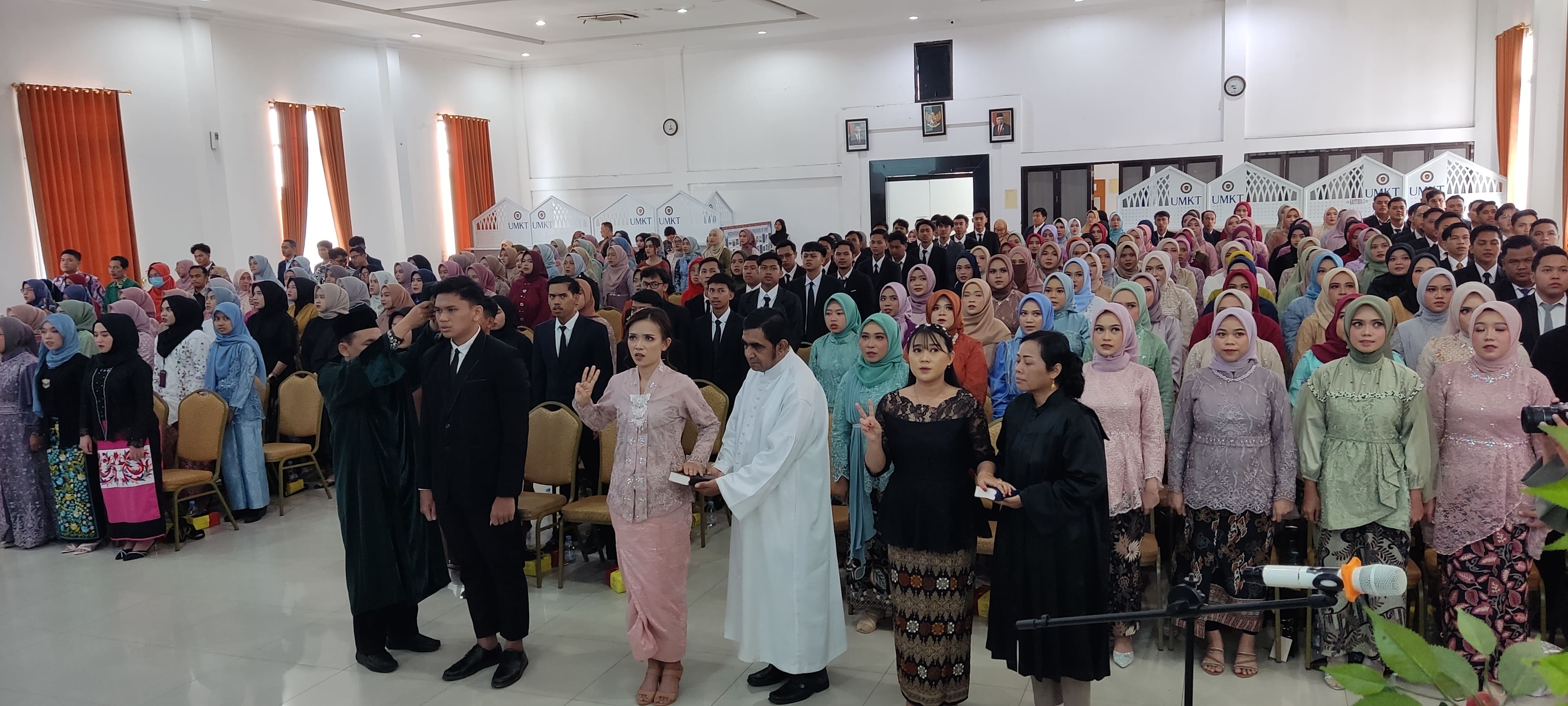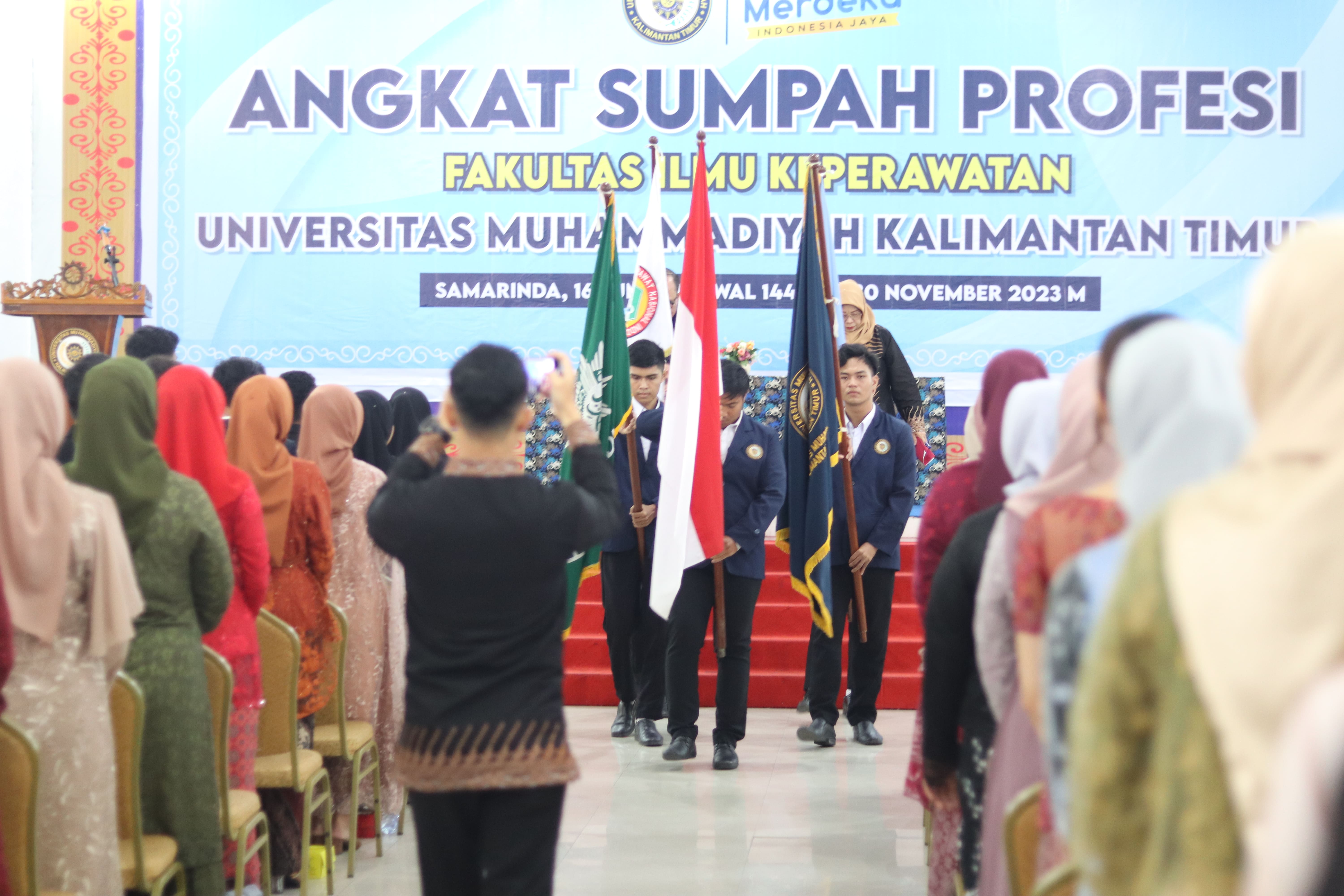 Fakultas Ilmu Keperawatan Universitas Muhammadiyah Kalimantan Timur (FIK UMKT) menggelar acara Angkat Sumpah Lulusan Program Studi D3 Keperawatan dan Program Profesi Ners Tahun Akademik 2022-2023 di Aula Gedung E Lantai 4 UMKT, Kamis (30/11/2023).