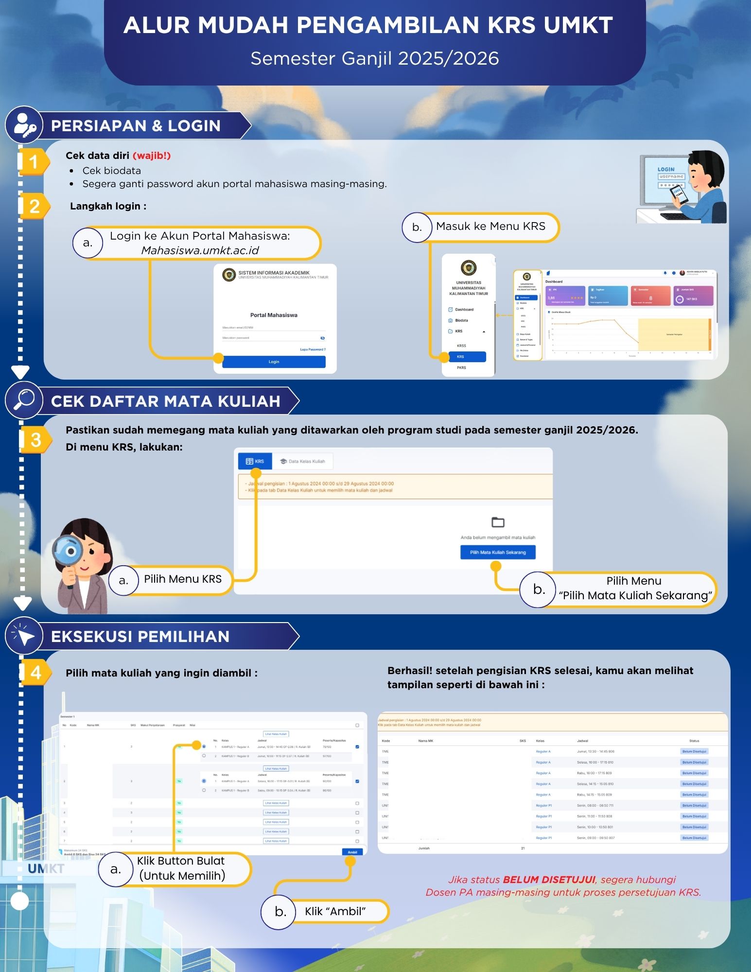 Pengisian Kartu Rencana Studi (KRS) merupakan kewajiban bagi semua mahasiswa sebelum perkuliahan dimulai. Proses ini dilakukan melalui laman https://sikad.umkt.ac.id/.