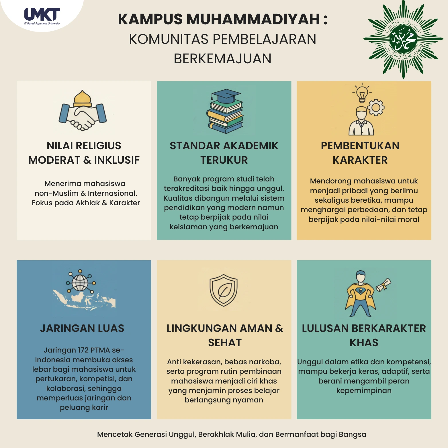 Salah satu keunggulan utama kampus Muhammadiyah adalah nilai religius yang moderat dan inklusif. Nilai inklusif kampus Muhammadiyah tercermin dalam menerima mahasiswa nonmuslim hingga mahasiswa internasional. Pendidikan tidak hanya berfokus pada akademik, tetapi juga akhlak dan pembentukan karakter. Lingkungan kampus mendorong mahasiswa untuk menjadi pribadi yang berilmu sekaligus beretika, mampu menghargai perbedaan, dan tetap berpijak pada nilai-nilai moral. Inilah yang membuat suasana belajar terasa lebih hangat, suportif, dan jauh dari tekanan yang tidak perlu.