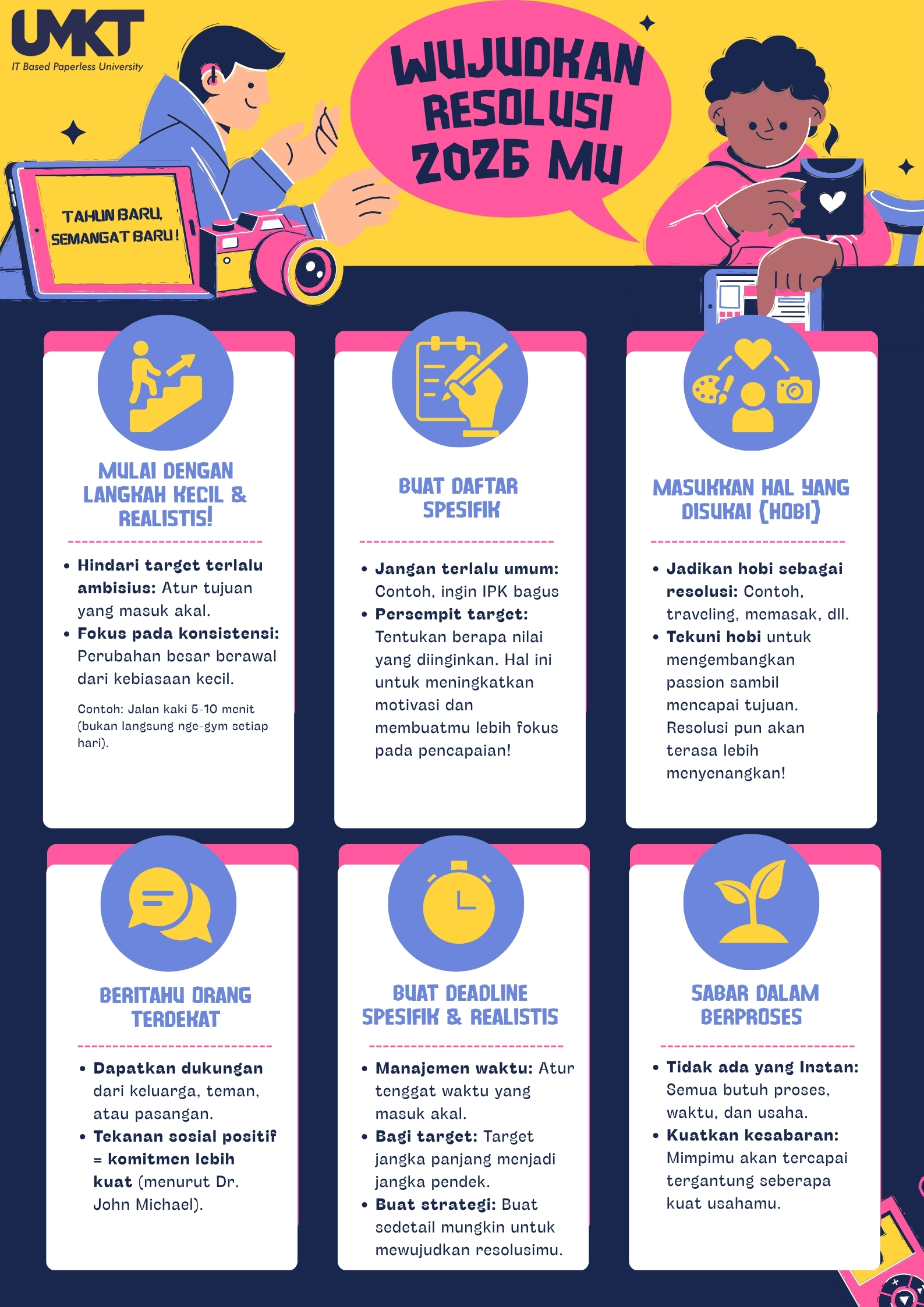 umkt.ac.id, Samarinda – Tahun Baru kerap dimaknai sebagai momentum untuk menyusun resolusi yang ingin dicapai sepanjang tahun. Menurut KBBI edisi VI, resolusi adalah pernyataan tertulis, yang biasanya berisi tuntutan atau keputusan tentang suatu hal. Oleh karena itu, resolusi tahun baru umumnya diisi dengan berbagai target positif, mulai dari menerapkan gaya hidup yang lebih sehat, mengunjungi berbagai destinasi wisata, hingga meraih jenjang karier yang lebih baik.