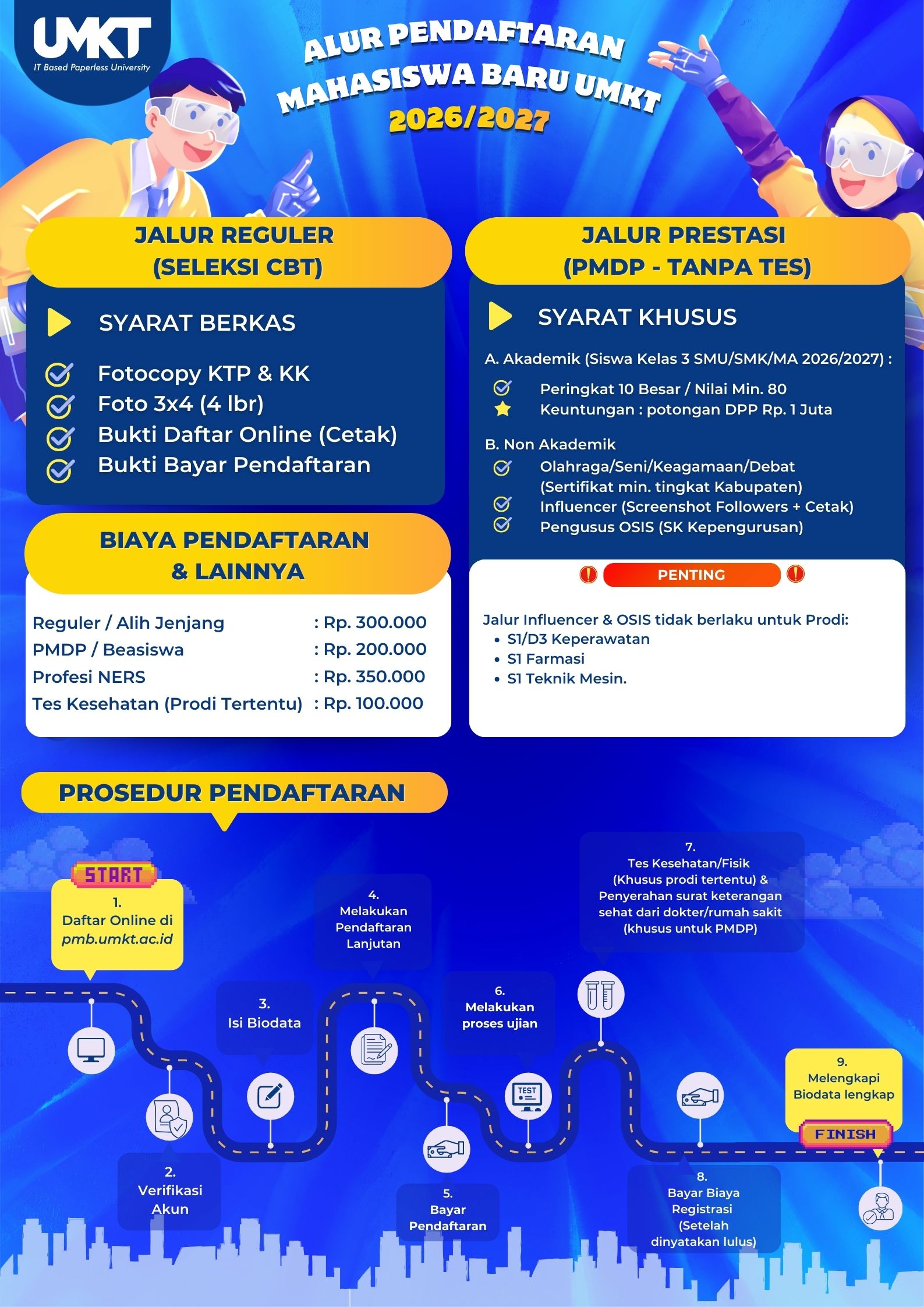 Untuk memberikan gambaran yang lebih jelas dan memudahkan calon mahasiswa dalam memahami alur serta persyaratan pendaftaran, berikut kami sajikan infografis alur pendaftaran mahasiswa baru UMKT tahun akademik 2026/2027. Infografis ini memuat informasi lengkap terkait jalur masuk, persyaratan berkas, biaya pendaftaran, hingga tahapan yang perlu dilalui, sehingga calon mahasiswa dapat mempersiapkan diri dengan lebih matang.