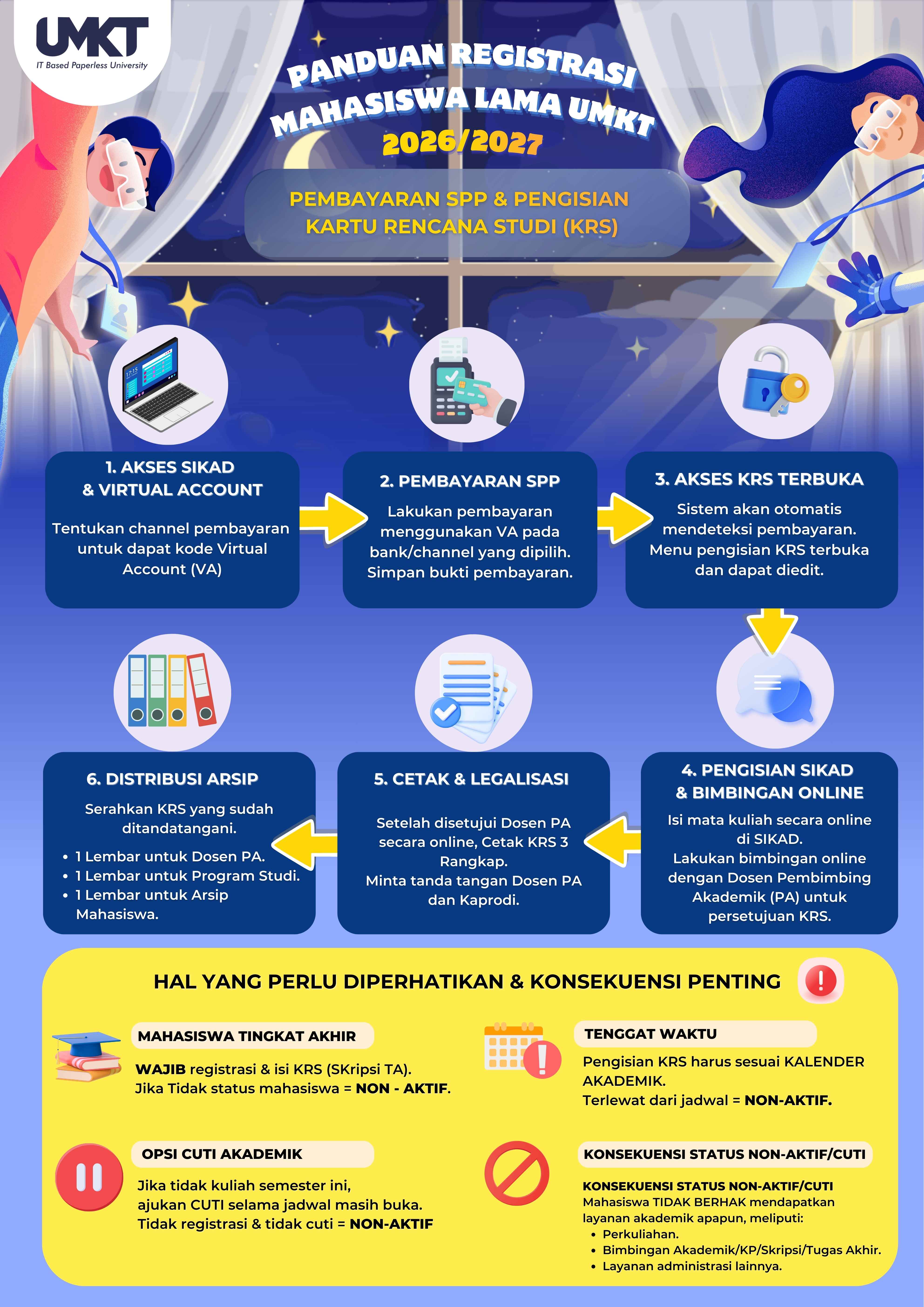 Silakan cermati infografis berikut sebagai panduan resmi pelaksanaan registrasi mahasiswa lama UMKT Tahun Akademik 2026/2027!