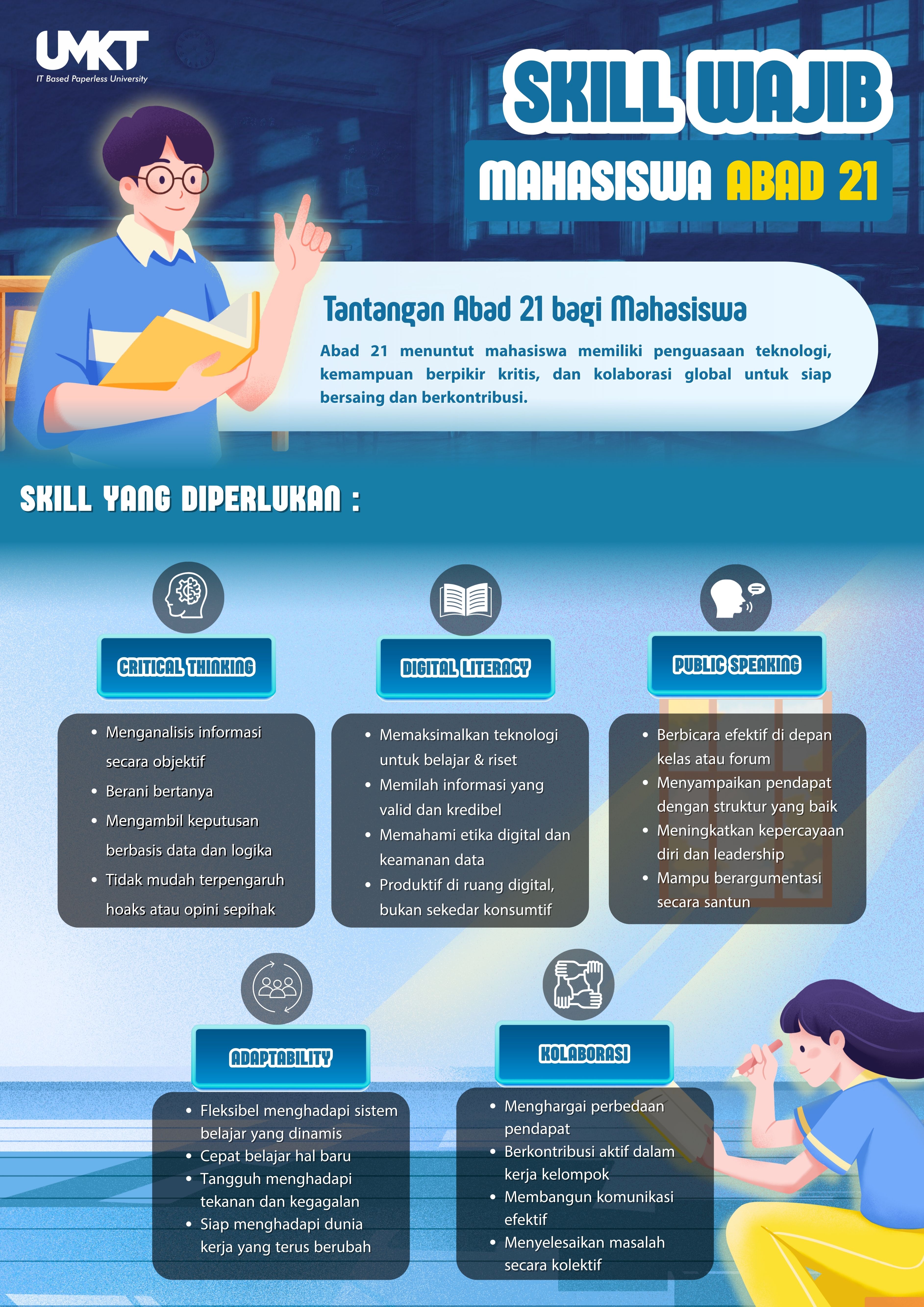 Infografis berikut merangkum lima keterampilan esensial yang perlu dimiliki mahasiswa masa kini. Kelima aspek ini bukan hanya relevan untuk dunia akademik, tetapi juga menjadi bekal utama dalam menghadapi dunia kerja, kepemimpinan, serta peran aktif sebagai agen perubahan di masyarakat.