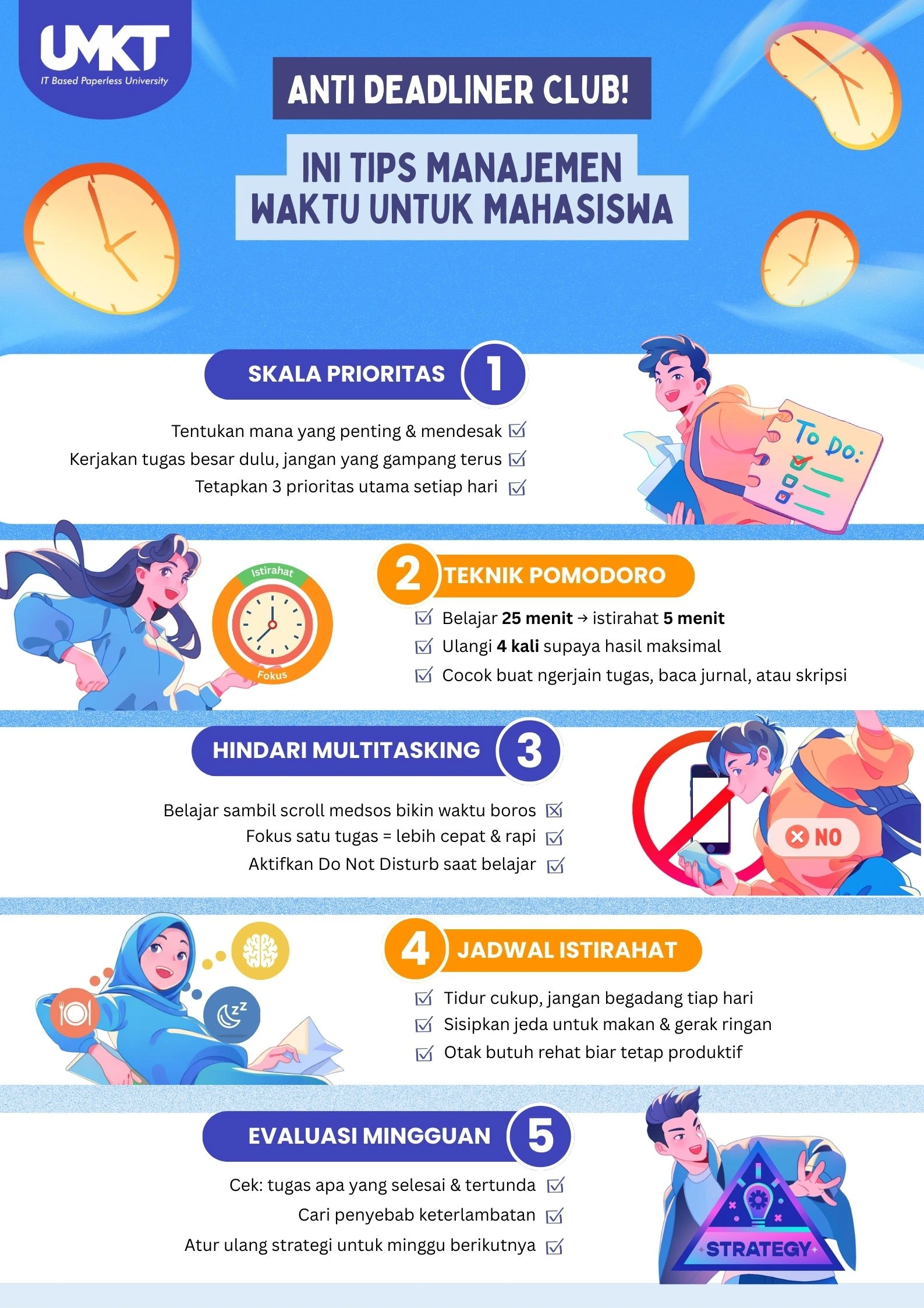 umkt.ac.id, Samarinda - Mengelola waktu dengan baik merupakan keterampilan penting yang perlu dimiliki setiap mahasiswa untuk menghadapi padatnya aktivitas akademik maupun non akademik. Tanpa strategi yang tepat, tugas dapat menumpuk dan produktivitas menurun. Melalui infografis berikut, mahasiswa diajak memahami langkah-langkah praktis dalam mengatur prioritas, menjaga fokus, hingga mengevaluasi progres belajar secara berkala. Tips ini diharapkan dapat membantu mahasiswa membangun kebiasaan belajar yang lebih terstruktur, efektif, dan seimbang sehingga mampu meraih hasil optimal selama masa perkuliahan.
