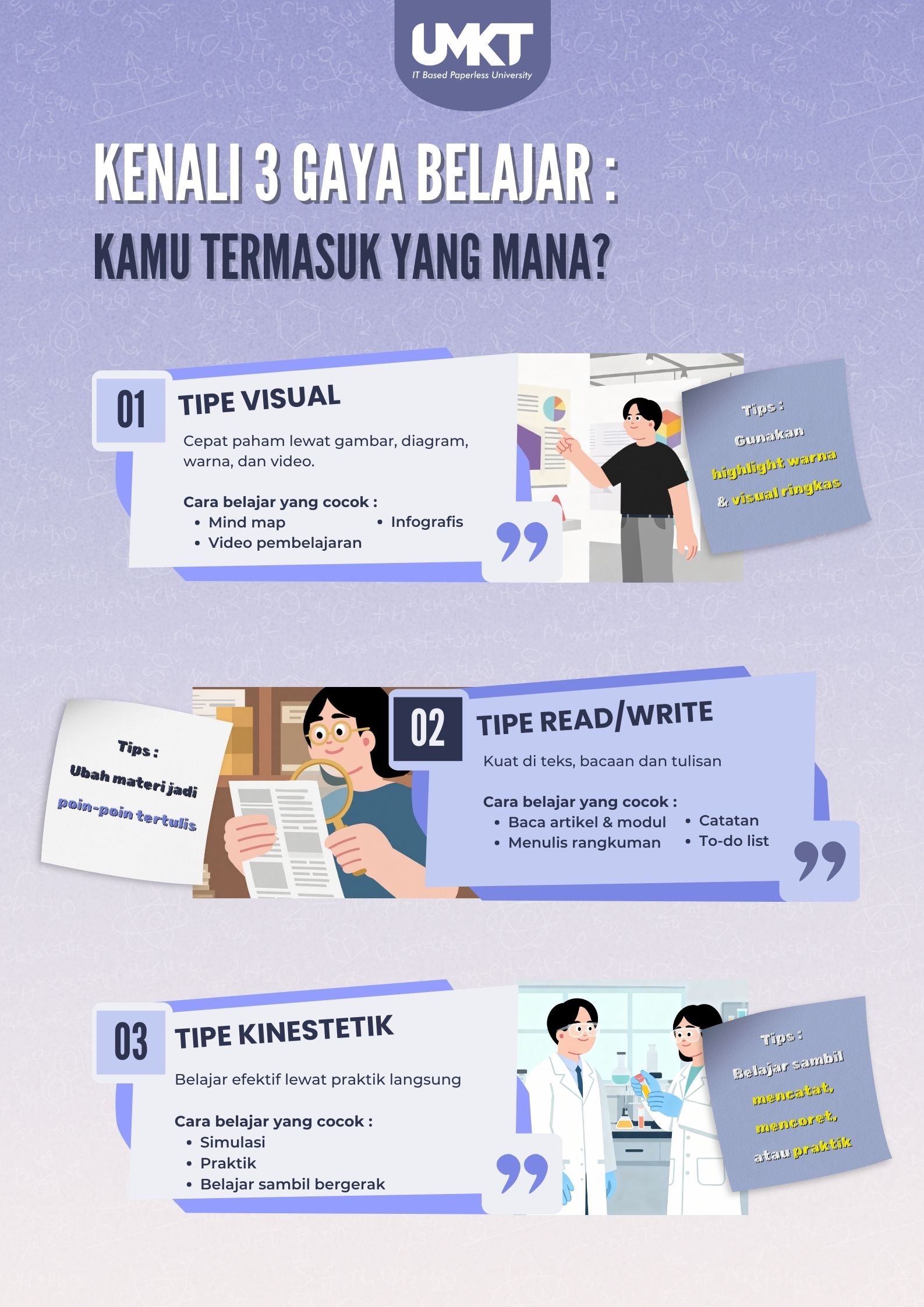 Dengan mengetahui kecenderungan gaya belajar yang dimiliki, mahasiswa dapat memilih strategi belajar yang paling sesuai. Infografis berikut membantu kamu mengenali tipe gaya belajar tersebut beserta tips sederhana yang bisa diterapkan dalam kegiatan belajar sehari-hari.