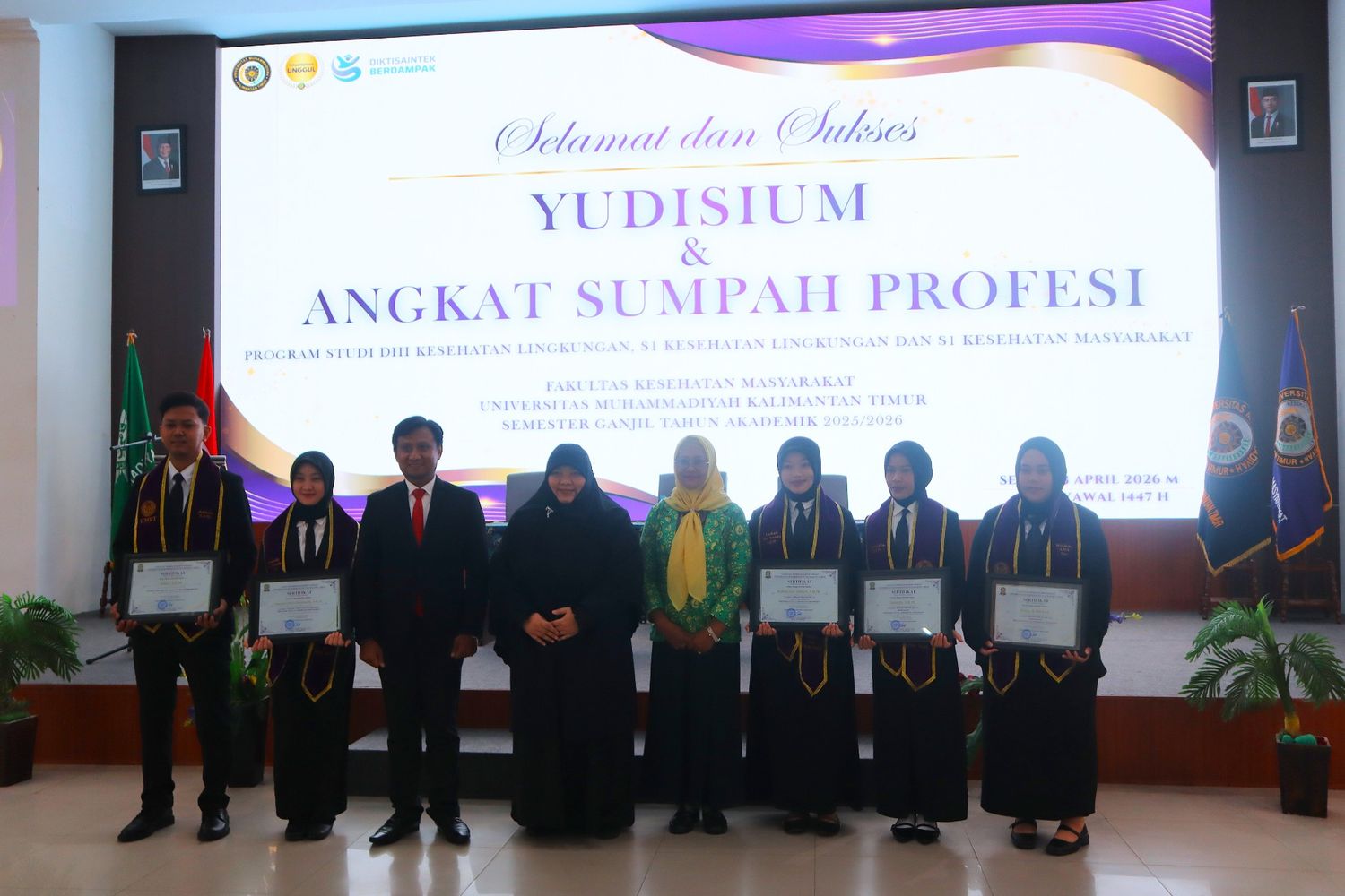 umkt.ac.id, Samarinda – Fakultas Kesehatan Masyarakat (FKM) Universitas Muhammadiyah Kalimantan Timur (UMKT) menggelar Yudisium dan Angkat Sumpah Profesi pada Senin (13/4), di Aula Gedung E UMKT. Turut hadir dalam kegiatan ini Ketua Himpunan Ahli Kesehatan Lingkungan (HAKLI) Kalimantan Timur, Dekan beserta jajaran Wakil Dekan, para Ketua Program Studi, dosen, rohaniawan, dan peserta yudisium.