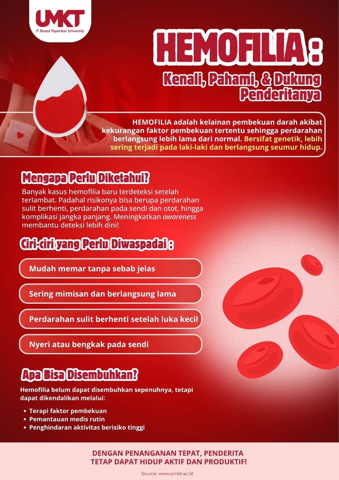 umkt.ac.id, Samarinda - Hemofilia sering kali tidak disadari, hingga muncul gejala yang serius. Padahal, pemahaman sejak dini menjadi kunci untuk mencegah komplikasi dan meningkatkan kualitas hidup penderitanya.