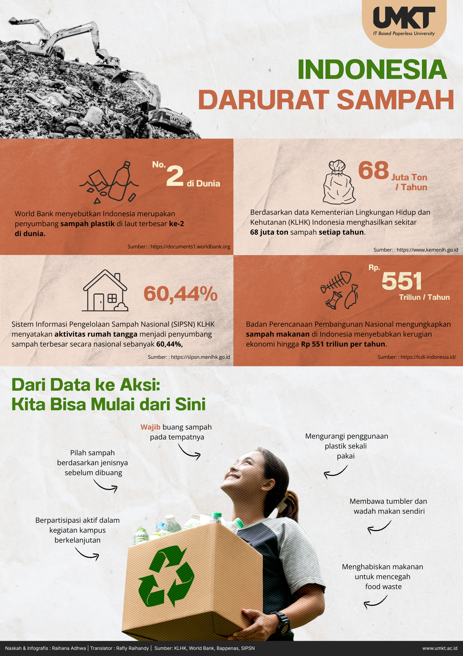 umkt.ac.id, Samarinda - Indonesia tengah menghadapi persoalan sampah yang tidak bisa lagi dianggap sepele. Data menunjukkan bahwa volume sampah terus meningkat setiap tahun, dengan kontribusi terbesar berasal dari aktivitas sehari-hari di tingkat rumah tangga. Dampaknya tidak hanya mencemari lingkungan, tetapi juga merambah ke persoalan ekonomi, kesehatan, hingga keberlanjutan ekosistem laut.