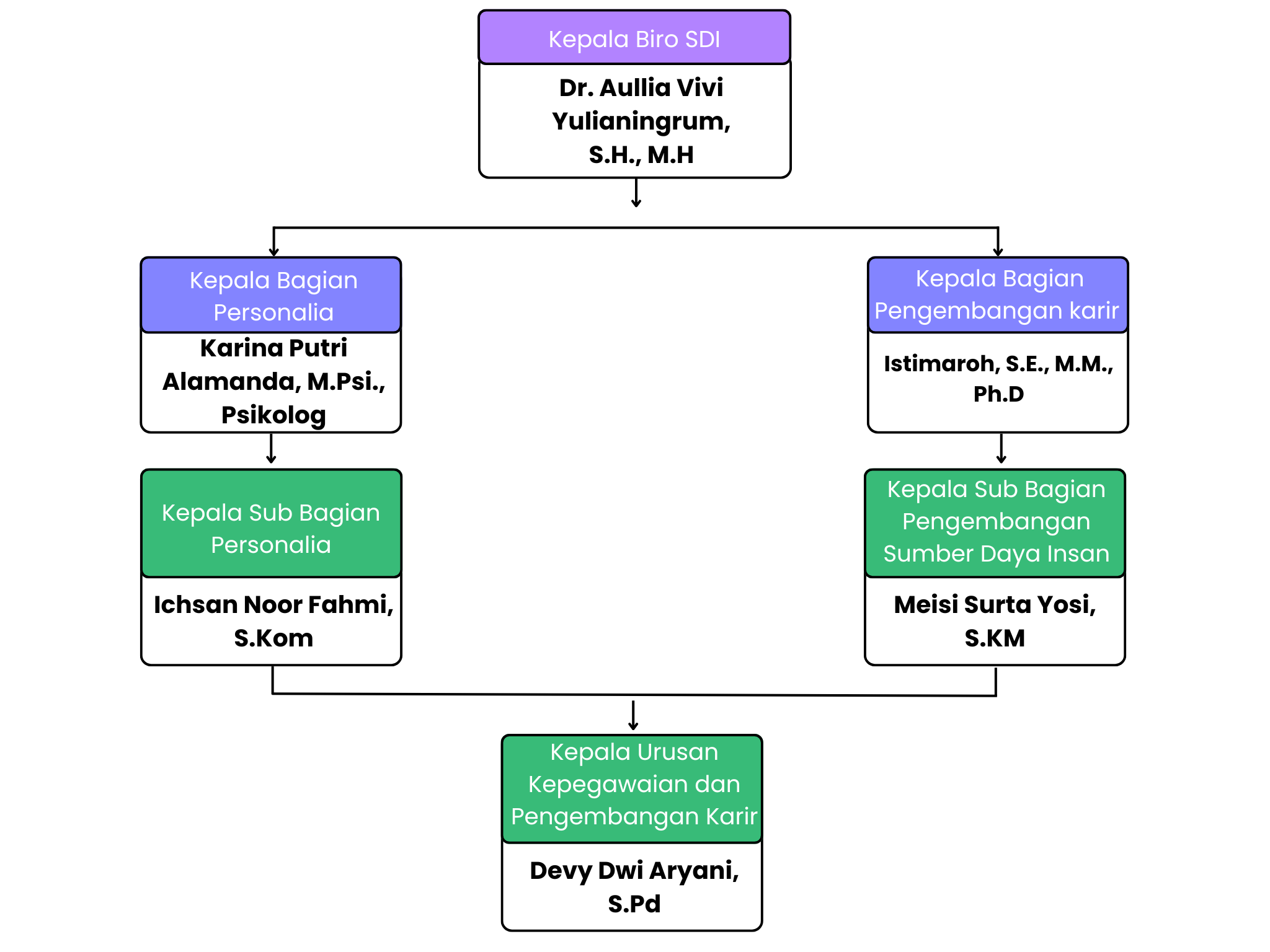 | Kepala Biro SDI | :Dr. Aullia Vivi Yulianingrum, S.H., M.H |