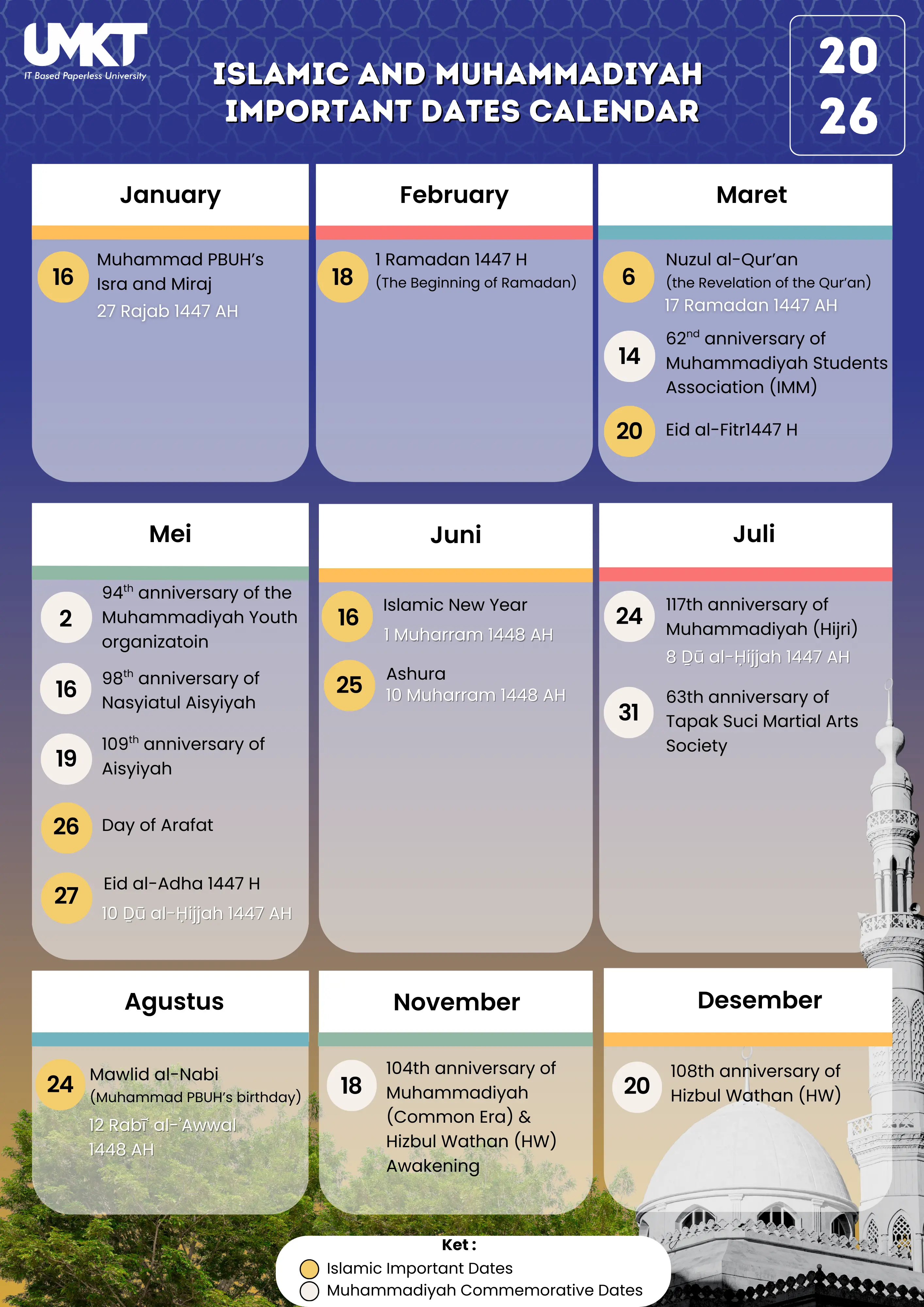 umkt.ac.id, Samarinda - Every journey, time always presents significant moments that are not merely historical markers, but also reminders of the values that shape identity. The Muhammadiyah and Islamic Important Days Calendar 2026 below is compiled as a guide for all members of the Universitas Muhammadiyah Kalimantan Timur (UMKT) to understand and appreciate the valuable moments throughout the year. From commemorations of the birth of figures, organizational anniversaries, to major religious holidays that enrich spirituality.