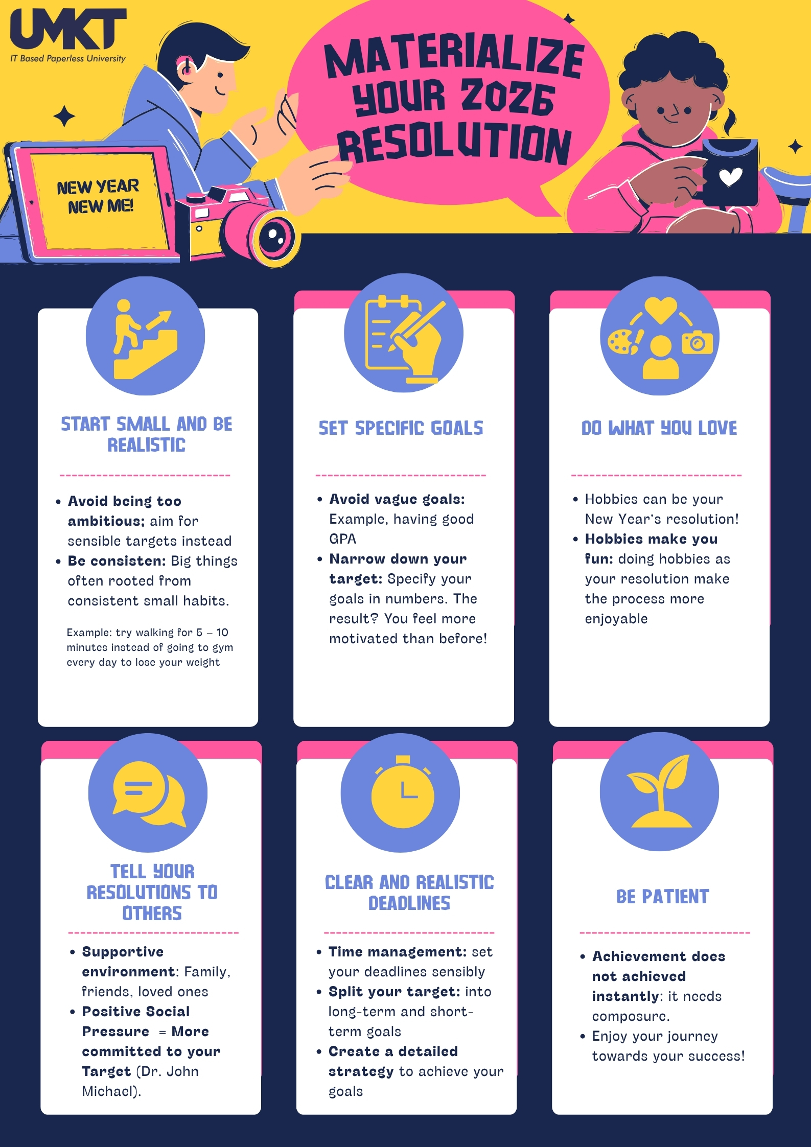 umkt.ac.id, Samarinda – "New Year, New Me!" It’s the iconic mantra heard at every New Year’s Eve celebration. Beyond the festivities, the turn of the year is almost synonymous with the "New Year’s Resolution." Merriam-Webster defines a resolution as “a personal expression of will or intent, especially in pursuit of a goal.” It is no surprise, then, that people pack their resolutions with ambitious targets, ranging from improving physical well-being and exploring new travel destinations to pursuing better career opportunities.