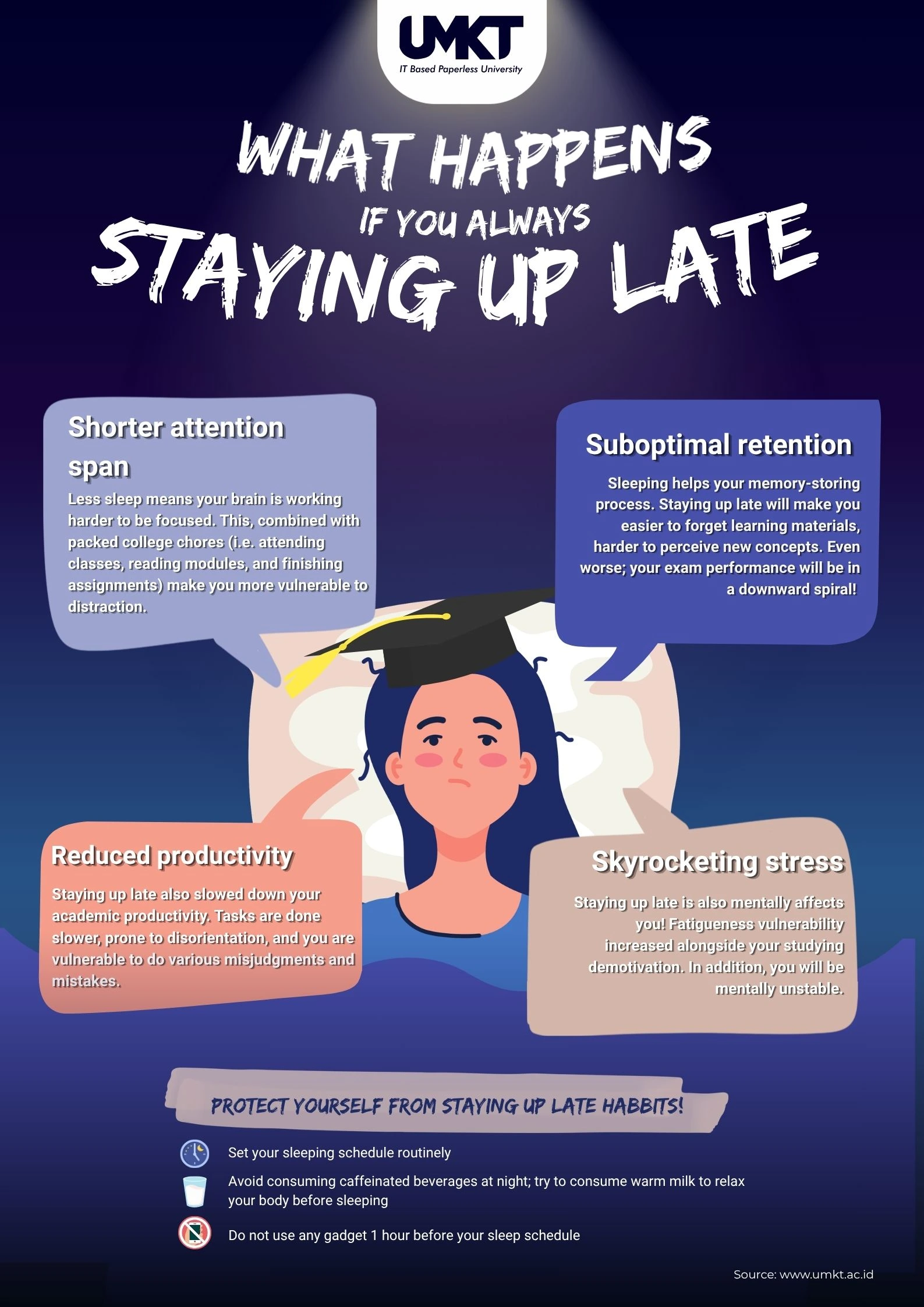 umkt.ac.id, Samarinda - In the midst of demanding academic schedules and extracurricular responsibilities, staying up late is often seen as the only way to meet imminent deadlines. However, chronic sleep deprivation does more than just cause physical fatigue; it significantly impairs cognitive function and mental well-being.