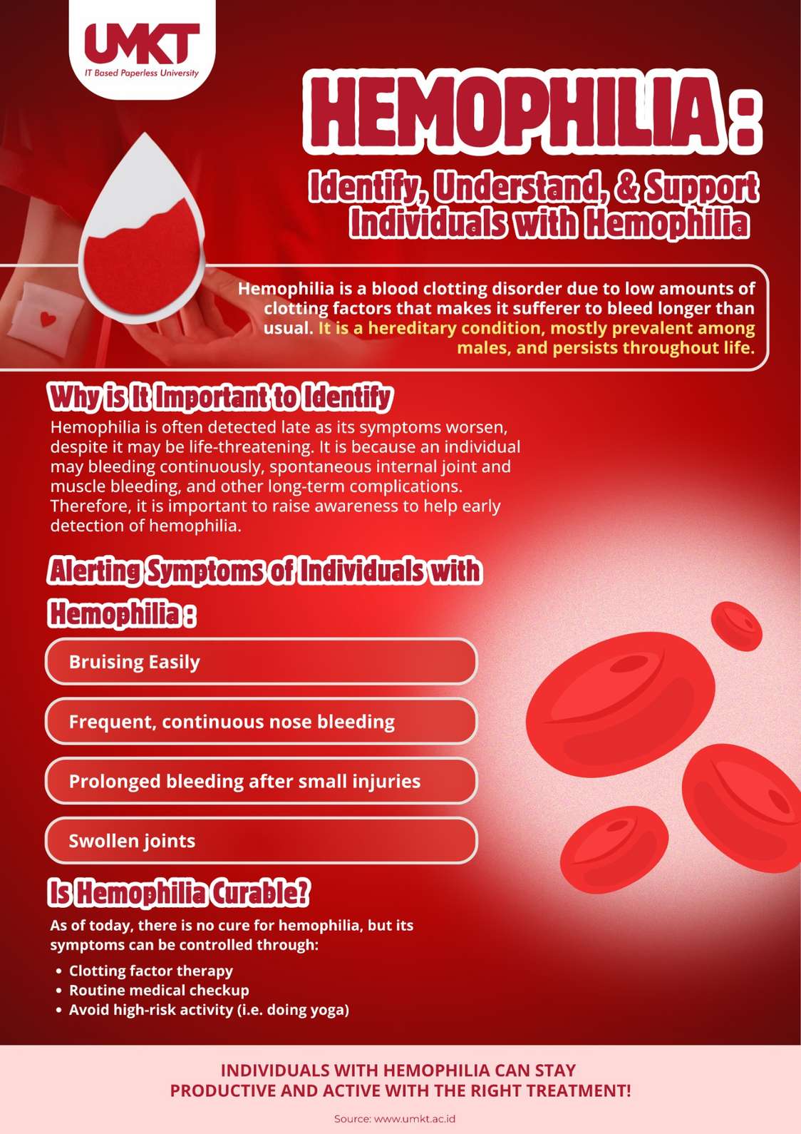umkt.ac.id, Samarinda - Often misunderstood until serious symptoms arise, hemophilia requires early identification to prevent life-threatening complications. Understanding the signs is the first step toward improving the quality of life for those with the disorder.