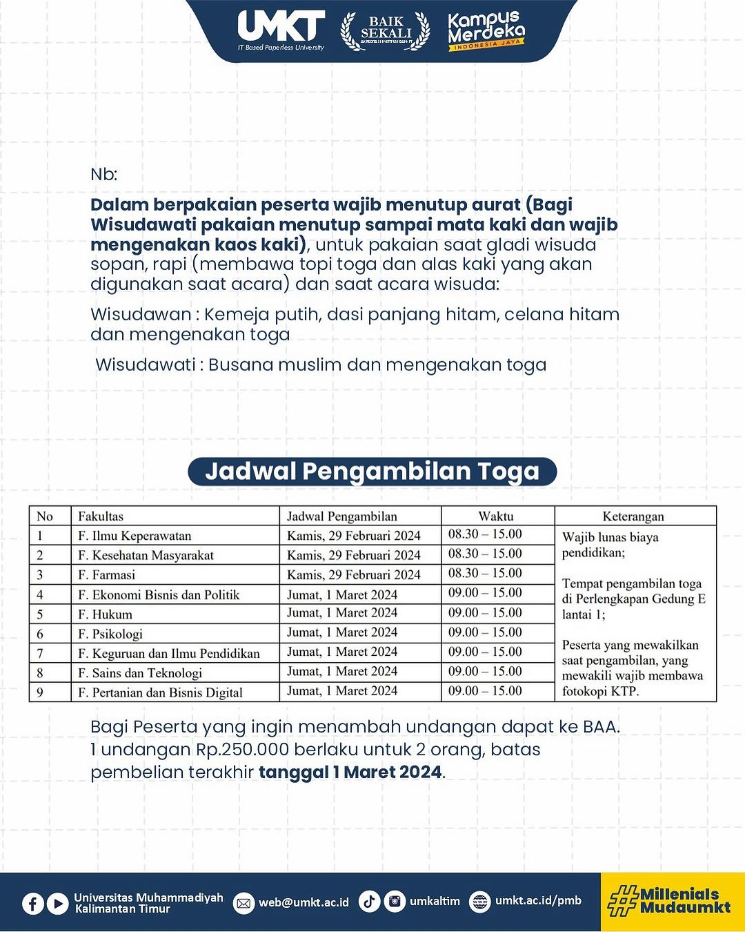 Segala puji bagi Allah SWT yang masih memberikan kesehatan kepada kita baik jasmani maupun rohani sehingga kita masih dapat menjalankan aktivitas. Dalam rangka wisuda Program Diploma, Sarjana, Profes, dan Magister Universitas Muhammadiyah Kalimantan Timur tahun 2024 yang Insya Allah akan dilaksanakan pada:
