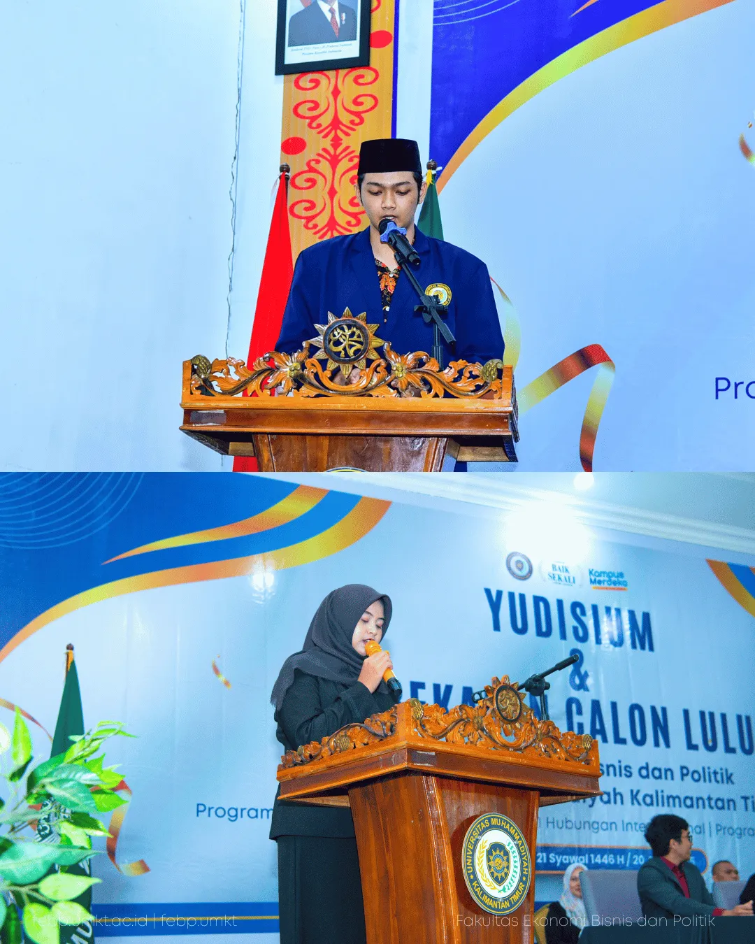 Prosesi yudisium berlangsung khidmat, diawali dengan menyanyikan lagu Indonesia Raya dan Mars Muhammadiyah. Acara resmi dibuka oleh Dekan FEBP, kemudian dilanjutkan pembacaan ayat suci Al-Qur’an oleh perwakilan mahasiswa. Dalam sambutannya, Prof. Farid menyampaikan pesan mengenai pentingnya integritas, kompetensi, serta keberanian menghadapi tantangan dunia kerja.