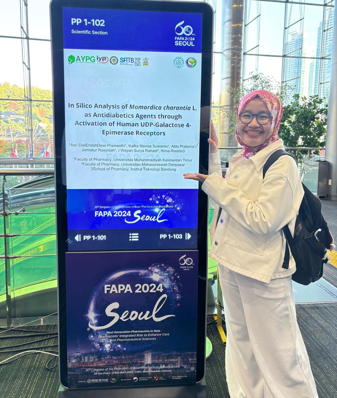 SEOUL, KOREA SELATAN - Dosen Farmasi UMKT, apt. Asri Dwi Endah Dewi Pramesthi, M.Pharm.Sci, mengikuti the 30th Congress of the Federation of Asian Pharmaceutical Associations (FAPA 2024) di COEX Convention & Exhibition Center, Seoul, Korea Selatan. Kongres dan konferensi internasional ini diselenggarakan oleh Korean Pharmaceutical Association (KPA) sebagai tuan rumah, berlangsung sejak tanggal 29 Oktober hingga 2 November 2024. Pada agenda tersebut, dosen yang kerap disapa "Bu Asri" ini menunjukkan hasil penelitiannya yang dilakukan bersama dosen ITB, dosen UNMAS Denpasar, serta mahasiswa S1 Farmasi UMKT berjudul "In Silico Analysis of Momordica charantia L. as Antidiabetics Agents through Activation of Human UDP-Galactose-4-Epimerase Receptors".