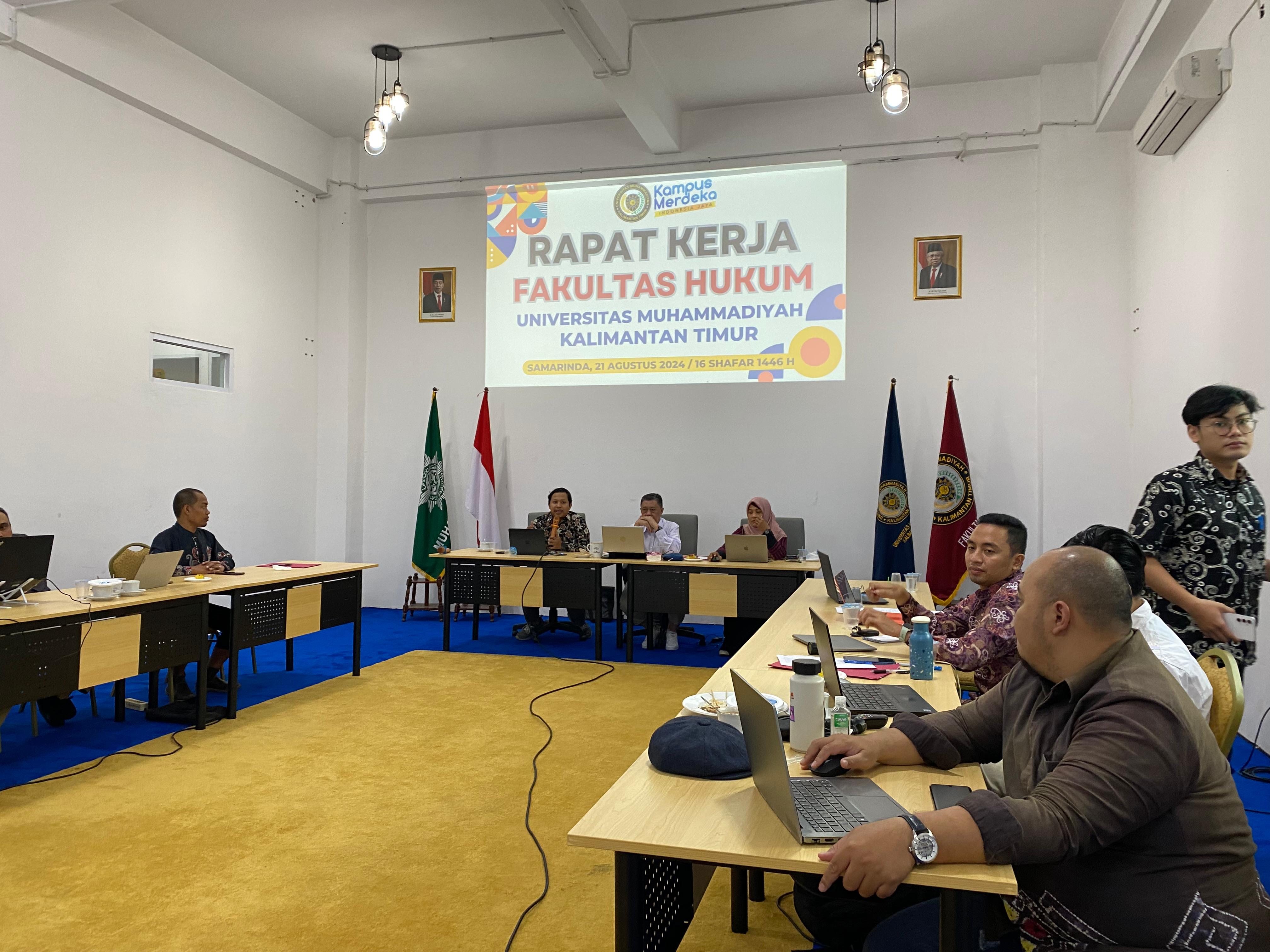 Rapat Kerja (Raker) Fakultas Hukum Universitas Muhammadiyah Kalimantan Timur (UMKT) tahun 2024 dilaksanakan pada tanggal 21 Agustus 2024. Raker ini merupakan kegiatan penting untuk mengevaluasi program kerja yang telah dilaksanakan selama setahun terakhir serta merencanakan langkah-langkah strategis untuk tahun 2024 dan 2025. Dalam rapat ini, berbagai isu terkait kualitas dan jaminan mutu fakultas dibahas, terutama terkait dengan re-akreditasi program studi S1 Hukum dan akreditasi program studi S2 Hukum. Salah satu topik utama yang dibahas adalah upaya peningkatan publikasi dosen dan pentingnya pengembangan karir dosen yang melibatkan penentuan dosen yang akan mengikuti program tugas belajar serta peningkatan kompetensi dosen melalui pendidikan lanjut.