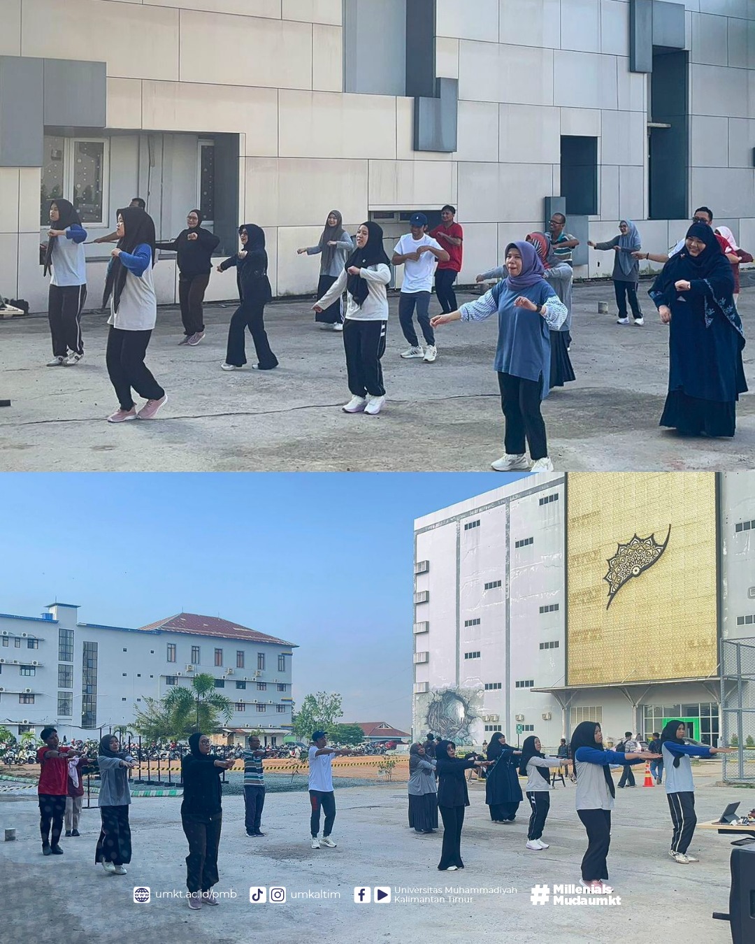 Samarinda, 16 Oktober 2025 – Dalam rangka mewujudkan lingkungan kerja yang sehat dan harmonis, dosen serta tenaga kependidikan (tendik) Fakultas Kesehatan Masyarakat Universitas Muhammadiyah Kalimantan Timur (FKM UMKT) melaksanakan kegiatan senam bersama di halaman kampus.