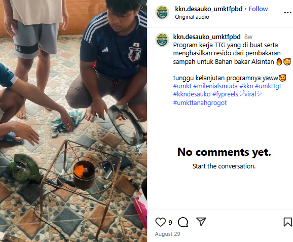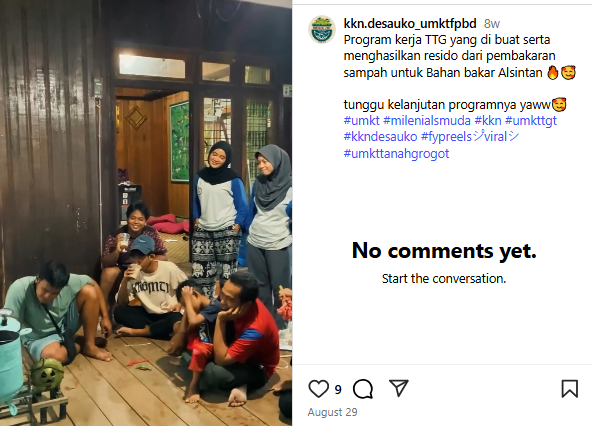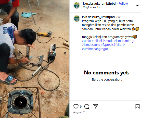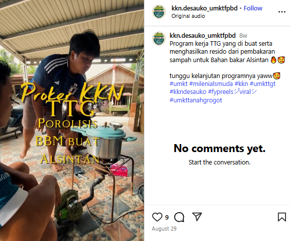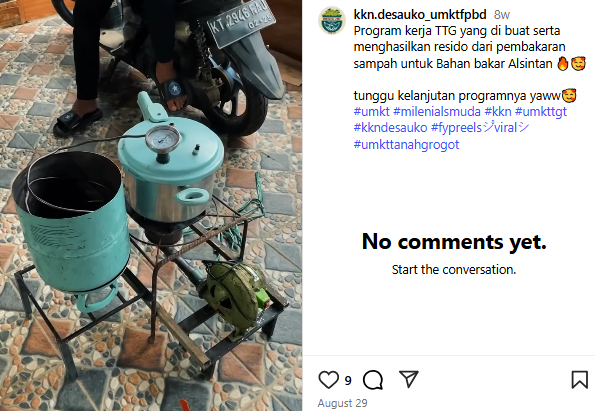 Mahasiswa mengenalkan dan melatih secara langsung masyarakat sekaligus melakukan uji coba bersama untuk dapat digunakan sebagai bahan bakar. Dengan adanya inovasi tersebut, diharapkan masyarakat berkontribusi mengurangi sampah yang nantinya dapat merusak lingkungan, ekosistem daratan dan lautan (SDG's 13, 14, 15).