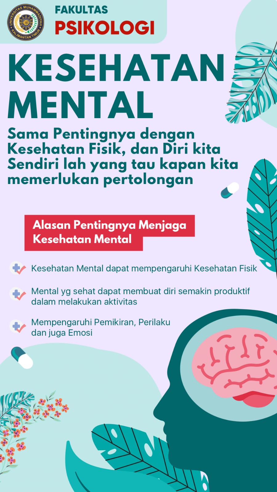PSIKOEDUKASI : Kesehatan mental adalah keadaan dimana individu terbebas dari segala gejala gangguan mental. Individu yang sehat secara mental dapat berfungsi secara normal dalam kehidupan mereka, terutama saat mereka beradaptasi untuk menghadapi masalah yang mereka hadapi sepanjang hidup dengan menggunakan keterampilan manajemen stres. Berikut dalam poster ini merupakan alasan penting mengapa kita harus menjaga kesehatan mental.