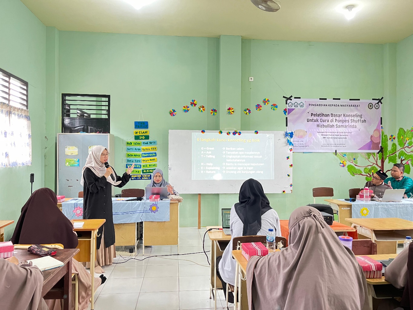 Dosen Fakultas Psikologi UMKT menggelar Pelatihan Dasar Konseling sebagai bentuk Pengabdian kepada Masyarakat (PkM) di Pondok Pesantren Shuffah Hisbullah Samarinda. Kegiatan ini ditujuan untuk para guru PAUD, SD dan SMP, di Pondok Pesantren tersebut agar memiliki kemampuan dasar konseling. Pelaksanaan kegiatan PkM dilakukan sebagai bentuk dari tindak lanjut kesepakatan/MoU (Memorandum of Understanding) antara Fakultas Psikologi UMKT dengan Pondok Pesantren Shuffah Hisbullah Samarinda.