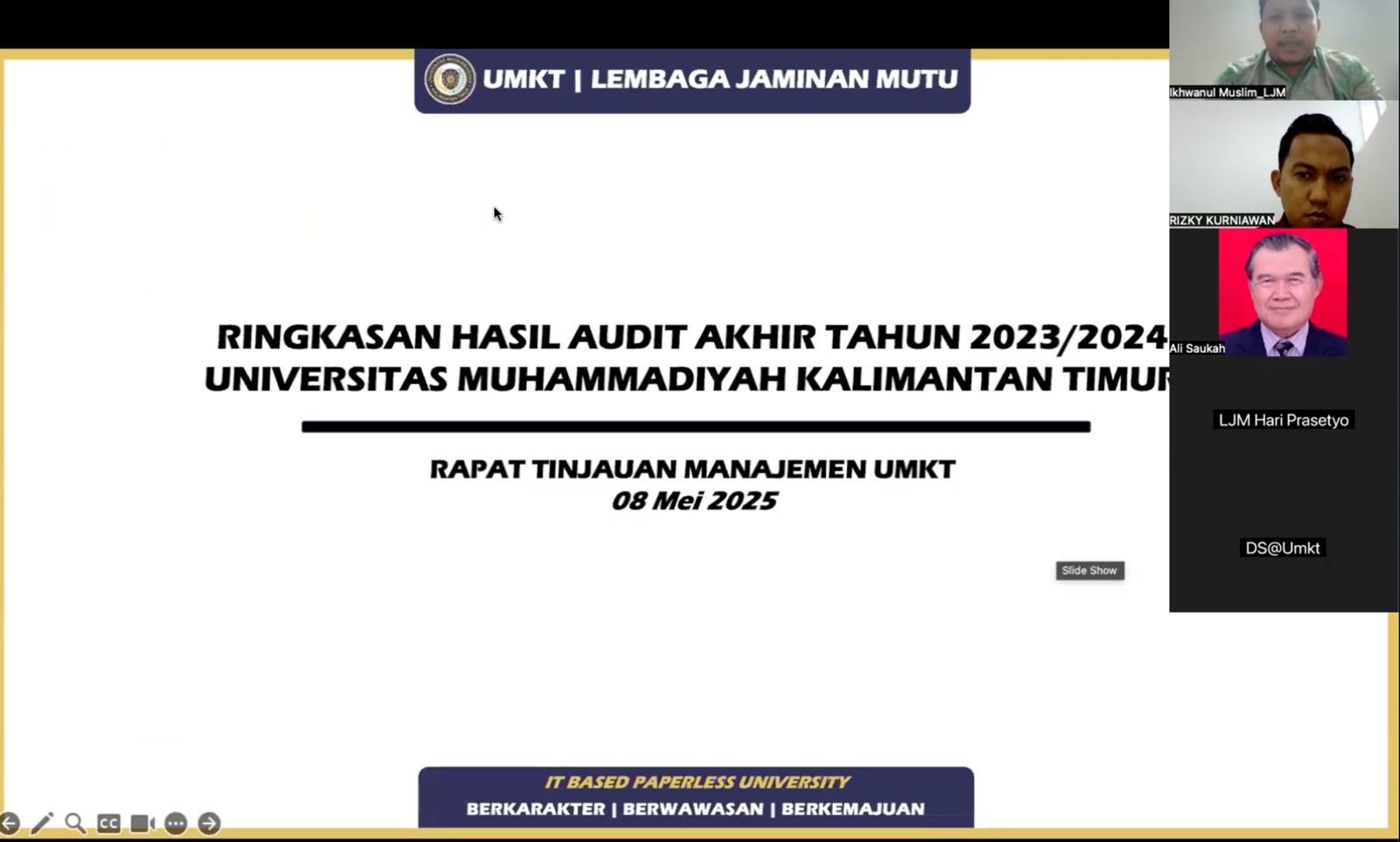Samarinda, 12 Mei 2025 — Universitas Muhammadiyah Kalimantan Timur (UMKT) melaksanakan Rapat Tinjauan Manajemen (RTM) pada Kamis, 8 Mei 2025. Kegiatan ini merupakan bagian dari siklus Sistem Penjaminan Mutu Internal (SPMI) yang dilaksanakan secara berkala guna mengevaluasi dan meningkatkan kinerja institusi.