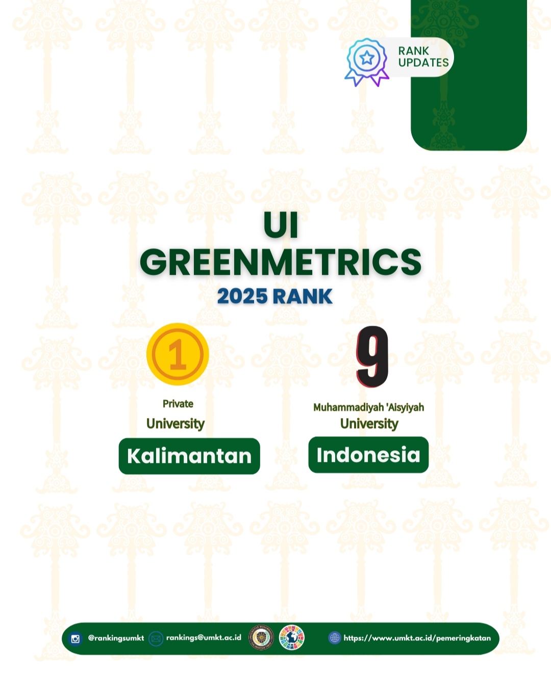 Pada tahun 2025, dengan dukungan fasilitas dan faktor lain yang dimiliki oleh UMKT, UMKT meraih peringkat pertama dalam Pemeringkatan UI Greenmetric. Kabar baik lainnya, UMKT berada pada 10 kampus terbaik Perguruan Tinggi Muhammadiyah 'Aisyiyah yang mengikuti UI Greenmetric. Pada tingkat dunia, UMKT berada di posisi 1.137 yang menjadi posisi baik. UMKT menunjukkan komitmen yang nyata dengan terus meningkatkan indikator yang ada menuju kampus hijau islami mendukung visinya menyelesaikan masalah Sosial Dan lingkungan.