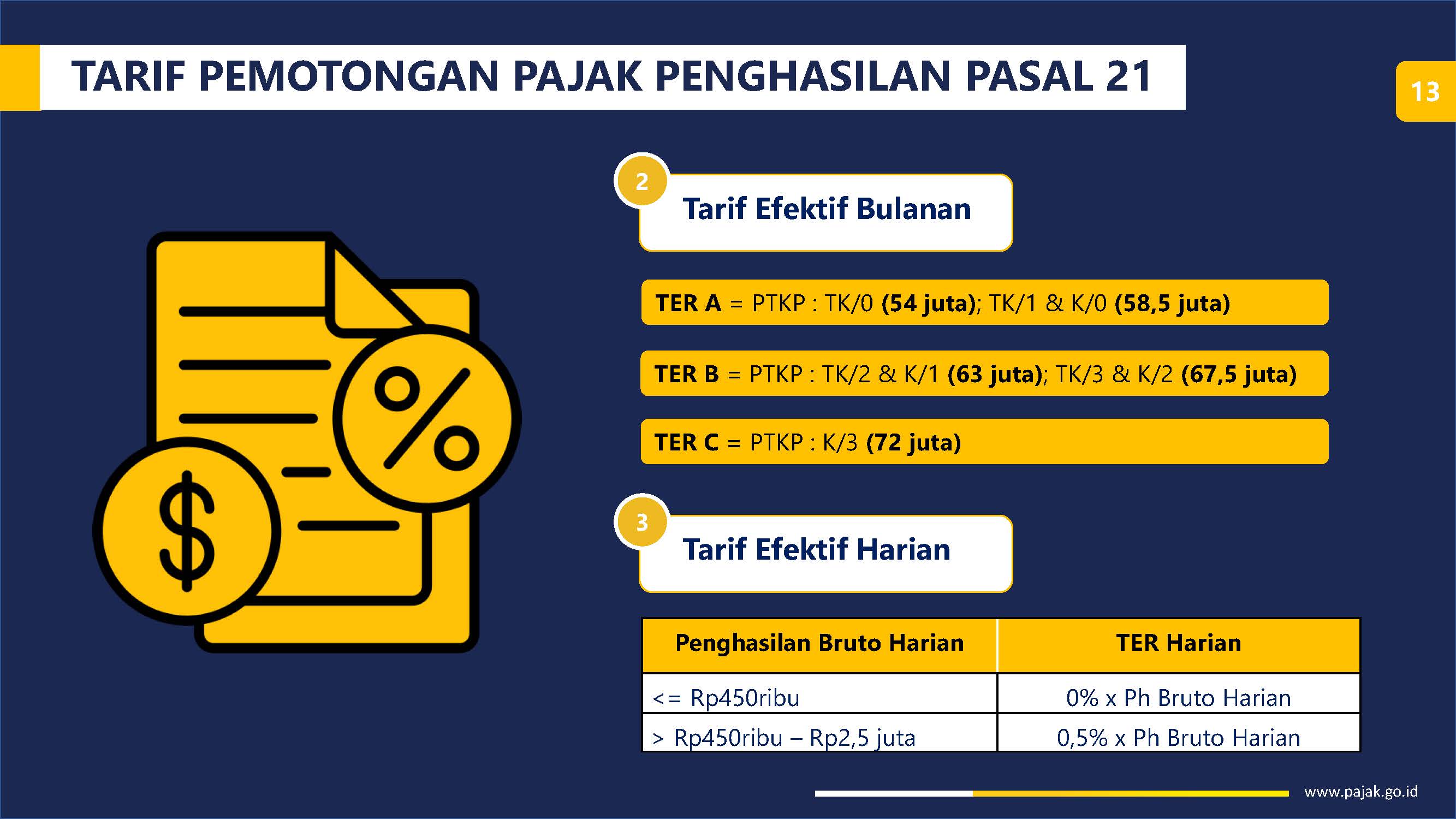 Penerapan kebijakan tarif efektif tidak memberikan tambahan beban pajak baru bagi masyarakat (pegawai) karena penghitungan kewajiban PPh Pasal 21 setahun menggunakan tarif yang sama dengan ketentuan yang berlaku sebelumnya. Terciptanya pengaturan di bidang perpajakan yang mendukung kemudahan berusaha bagi Wajib Pajak pemberi kerja (ease of doing business) sehingga diharapkan dapat meminimalisasi biaya yang harus dikeluarkan oleh Wajib Pajak dalam upaya memenuhi kewajiban perpajakan. Sejalan dengan adanya ease of doing business dan legal certainty, diharapkan terjadi penguatan basis sektor perpajakan dan dapat meningkatkan penerimaan negara dari sektor perpajakan