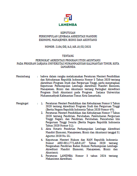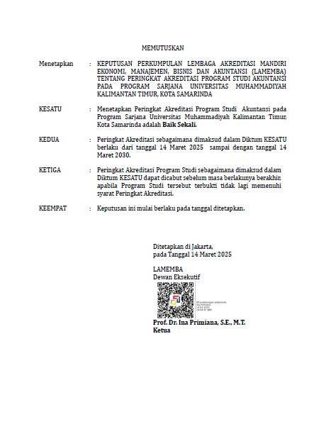 Pada 14/03/2025 berdasarkan Surat Keputusan Perkumpulan Lembaga Akreditasi Mandiri Ekonomi, Manajemen, Bisnis dan Akuntansi (LAMEMBA) No. 2106/DE/A.5/AR.10/III/2025 Menyatakan bahwa Program Studi Akuntansi Pada Program Sarjana Universitas Muhammadiyah Kalimantan Timur, Kota Samarinda Terakreditasi dengan peringkat ‘Baik Sekali’. Peringkat Akreditasi Program Studi sebagaimana dimaksud dalam Diktum KESATU berlaku dari tanggal 14 Maret 2025 sampai dengan 14 Maret 2030.