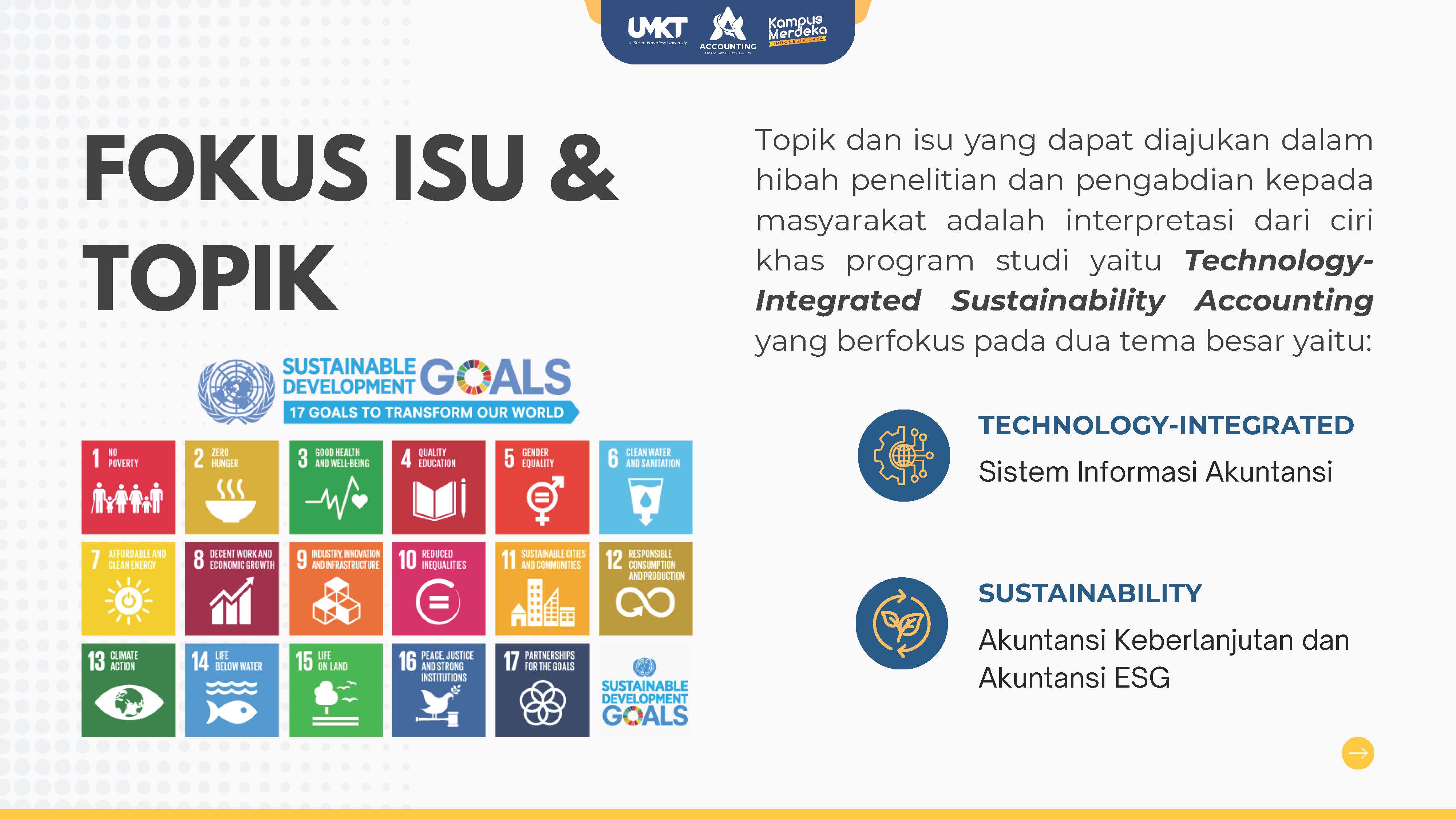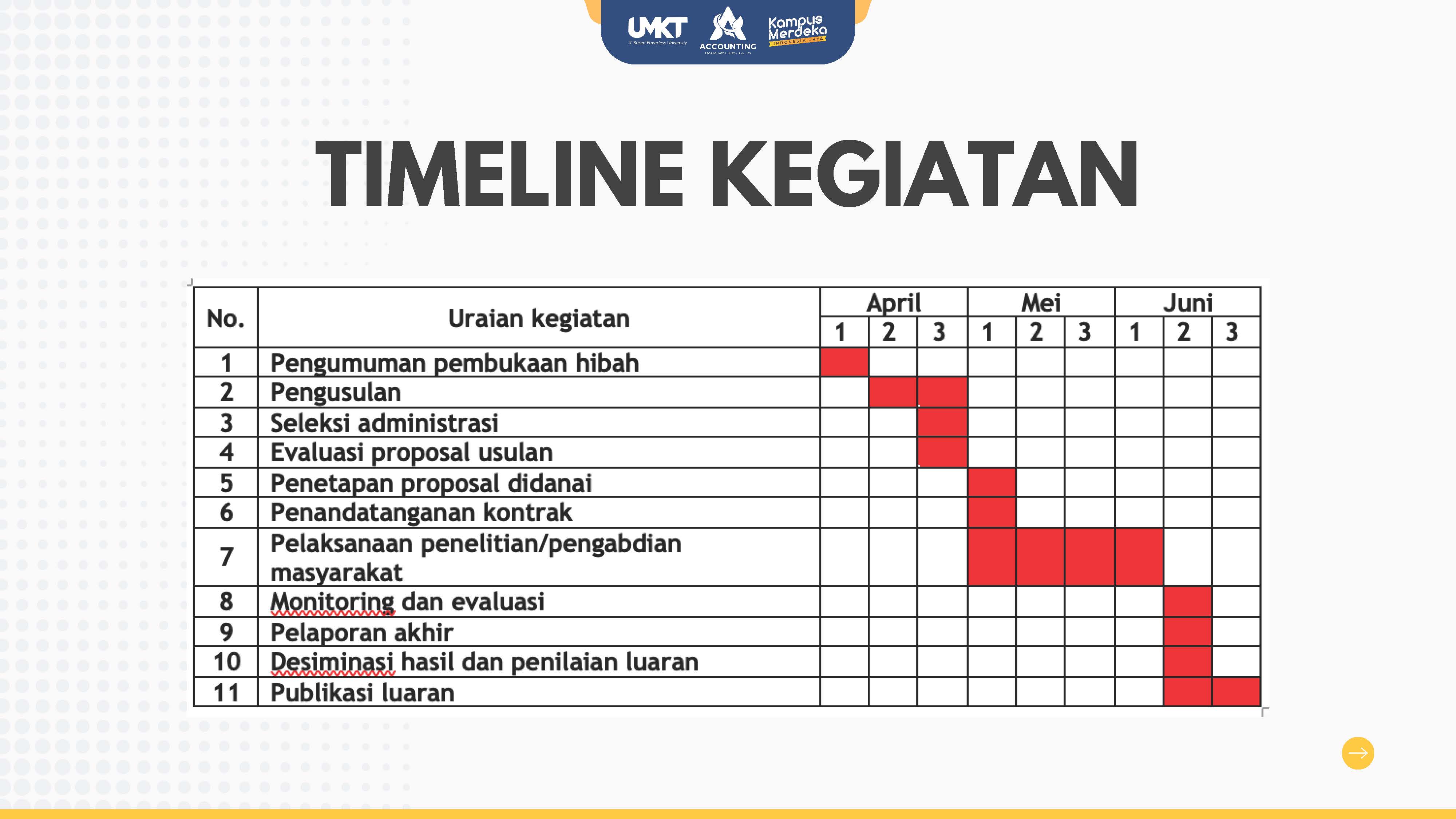Hibah penelitian dan pengabdian masyarakat Program Studi S1 Akuntansi memberikan kesempatan kepada mahasiswa untuk mengembangkan kemampuan akademik bidang ilmu akuntansi dan keterampilan sosial bermasyarakat. Dalam pelaksanaannya, proyek-proyek yang diusulkan hendaknya memperhatikan kebutuhan masyarakat dan dapat memberikan manfaat yang nyata. Selain itu, hibah penelitian dan pengabdian masyarakat juga dapat membuka peluang kerja sama antara mahasiswa dengan pihak-pihak lain seperti lembaga swadaya masyarakat, lembaga pemerintah, atau institusi pendidikan.