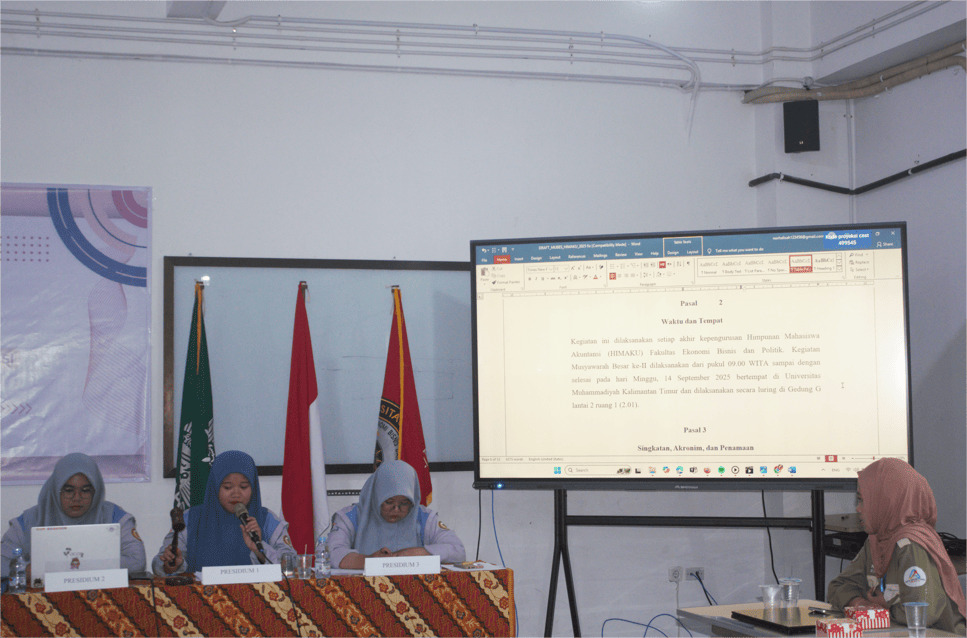 Pada 14/08/25 Himpunan Mahasiswa Akuntansi Universitas Muhammadiyah Kalimantan Timur, sukses menyelenggarakan Musyawarah Besar (MUBES) II pada. Acara ini berlangsung di Gedung G dengan dihadiri oleh Kepala Program Studi S1 Akuntansi, pengurus, anggota, serta perwakilan mahasiswa Akuntansi. Musyawarah Besar II menjadi forum tertinggi dalam organisasi mahasiswa yang berfungsi untuk mengevaluasi kepengurusan periode sebelumnya, menyusun garis besar program kerja ke depan, serta melakukan regenerasi kepemimpinan melalui pemilihan Ketua Himpunan Mahasiswa Akuntansi periode 2025/2026.