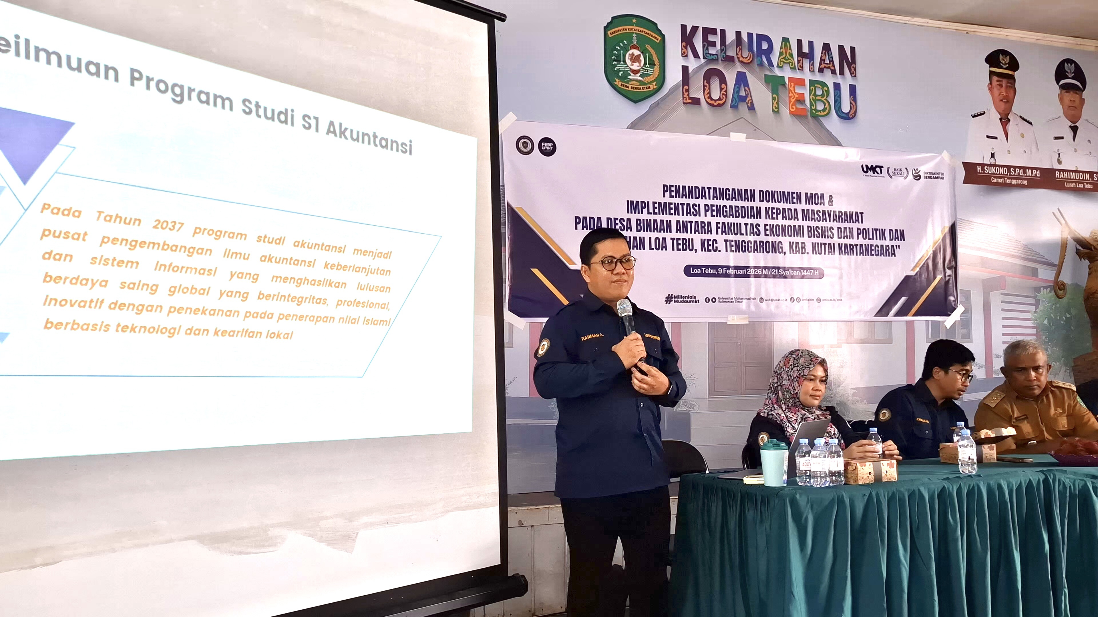 Program Studi S1 Akuntansi Fakultas Ekonomi, Bisnis dan Politik Universitas Muhammadiyah Kalimantan Timur (UMKT) turut berpartisipasi dalam kegiatan Penandatanganan Memorandum of Agreement (MoA) Desa Binaan yang dilaksanakan pada Senin, 9 Februari 2026 di Kelurahan Loa Tebu, Kabupaten Kutai Kartanegara. Kegiatan ini merupakan bagian dari upaya penguatan kerja sama antara perguruan tinggi dan pemerintah kelurahan dalam mendukung pelaksanaan program desa binaan berbasis edukasi, pemberdayaan, dan kontribusi keilmuan. Acara dimulai dengan proses registrasi peserta, dilanjutkan dengan pembukaan dan pembacaan doa, serta menyanyikan lagu Indonesia Raya. Kegiatan kemudian dilanjutkan dengan sambutan dari Wakil Dekan I Fakultas Ekonomi Bisnis dan Politik UMKT, Dr. Vera Anitra, S.E., M.M., yang menyampaikan pentingnya kolaborasi antara perguruan tinggi dan masyarakat dalam mendukung program pengabdian yang berkelanjutan. Sambutan berikutnya disampaikan oleh Lurah Loa Tebu, Bapak Rahimudin, S.E., yang menyambut baik kerja sama desa binaan serta berharap kegiatan ini dapat memberikan manfaat nyata bagi masyarakat.
