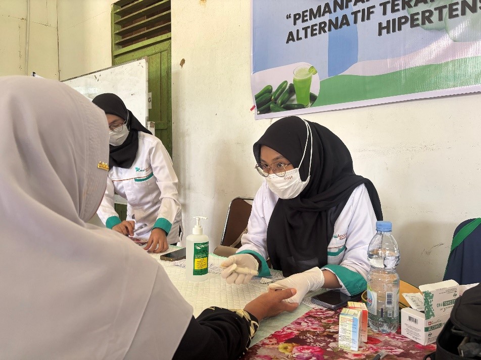 Secara bersamaan, kelompok lain menggelar edukasi di Kantor Desa Tanjung Batu dengan tema pemanfaatan timun sebagai terapi pendamping antihipertensi. Pemateri, Tiara Sophia Ananda, menjelaskan bahwa timun terbukti dapat membantu mengendalikan tekanan darah jika diolah dengan tepat. Kegiatan ini turut dirangkaikan dengan pemeriksaan kesehatan gratis, meliputi tekanan darah, gula darah, dan asam urat, yang didukung tenaga kefarmasian dari Central Apotek Samarinda.