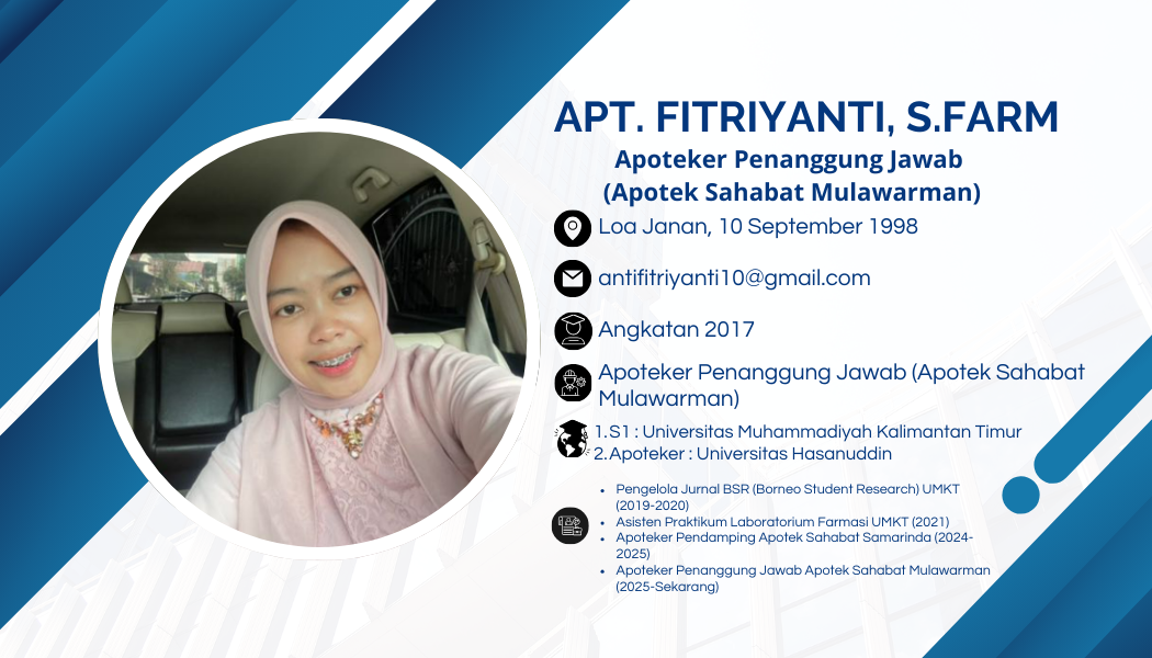 Jendela Alumni 𝐒𝐞𝐥𝐚𝐦𝐚𝐭 𝐃𝐚𝐭𝐚𝐧𝐠 𝐝𝐢 𝐉𝐞𝐧𝐝𝐞𝐥𝐚 𝐀𝐥𝐮𝐦𝐧𝐢 𝐔𝐌𝐊𝐓| Angkatan 2017apt. Fitriyanti, S.FarmAlumniNur Sholeh Aryodi Pernando, S.FarmAlumniRayhan Fahriza, S.Farm Alumni| Alumni 2018 Widya Rahmah, S.Farm., M.BiomedAlumniM. Rifqi Fadillah Muslim, M.FarmAlumni | Angkatan 2019Agnes Monica, S.FarmAlumniKhalish Arsy Al Khairy Siregar, S.FarmAlumniAlfin Syahrian Dwi Nugraha, S.FarmAlumni apt. Reni Selviana Devi, S.FarmAlumni