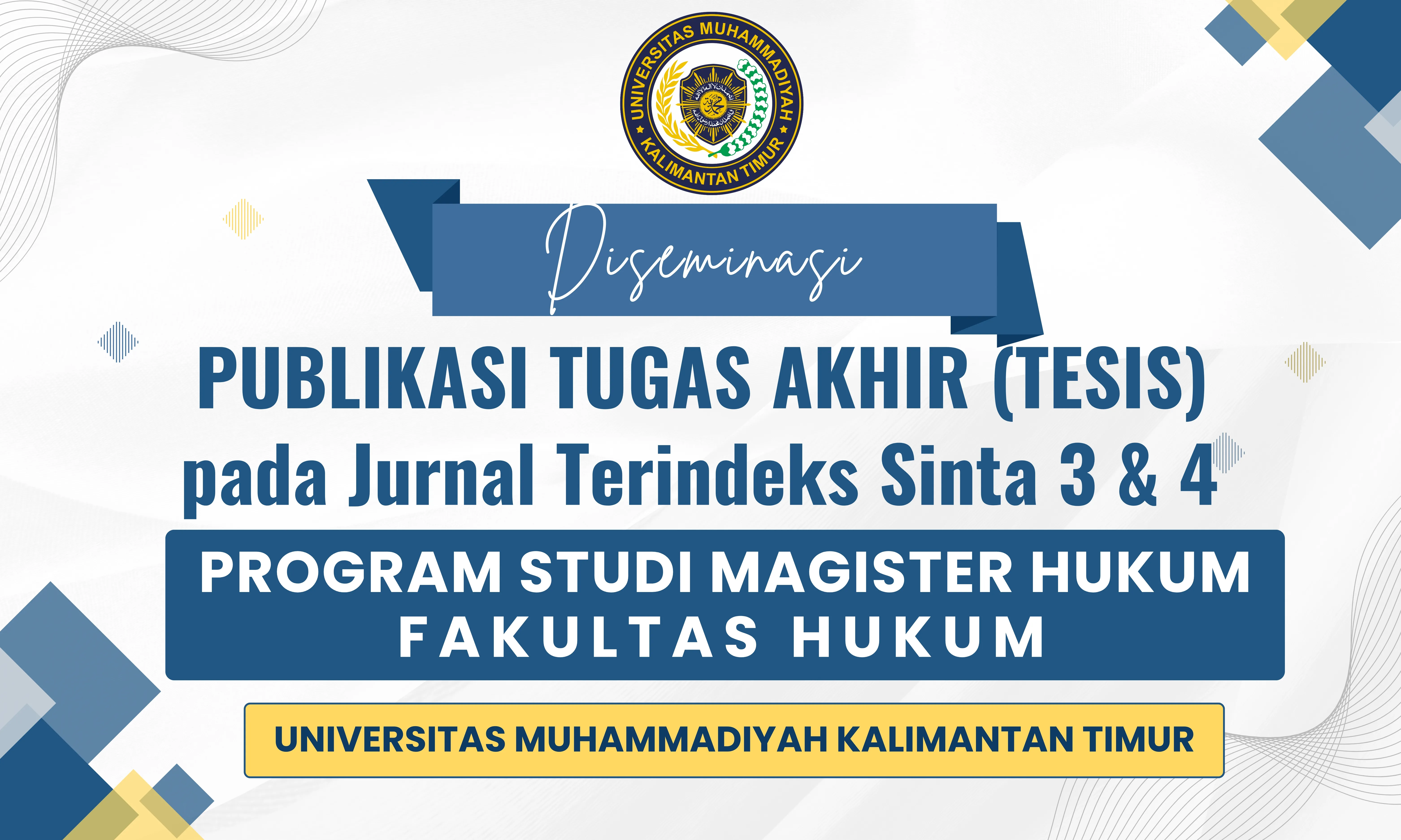Pada hari Jum'at Tanggal 24 Januari 2025 Program Studi Magister Hukum Universitas Muhammadiya Kalimantan Timur menggelar acara Diseminasi Tugas Akhir (Tesis) pada Jurnal Terindeks Sinta 3 & 4 yang diikuti oleh mahasiswa akhir program studi magister hukum. Acara ini bertujuan untuk mempresentasikan hasil penelitian tugas akhir mahasiswa dan memperoleh masukan dari dosen dan peserta lainnya.
