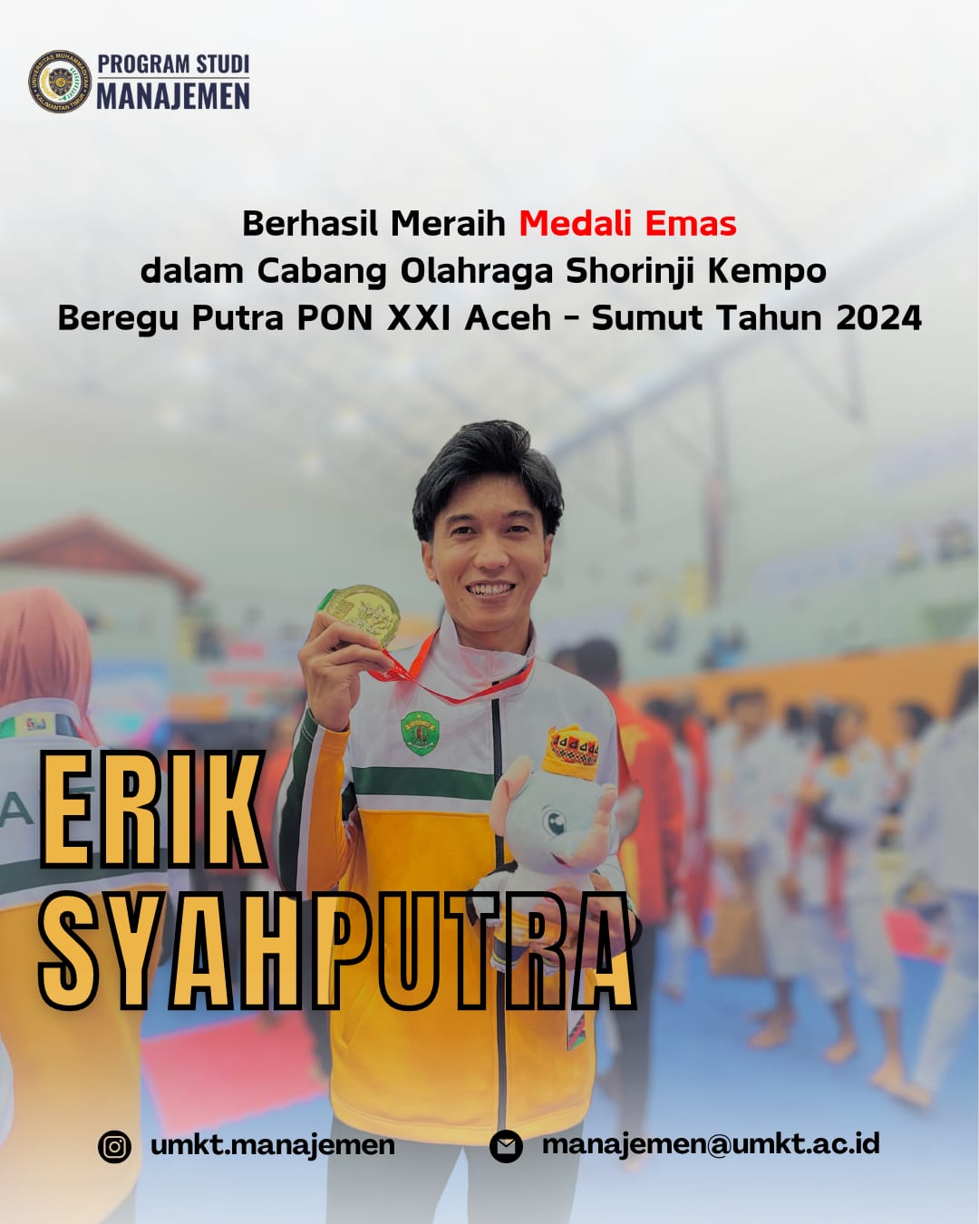 Erik Syahputra berhasil mengukir sejarah dengan meraih medali emas dalam cabang olahraga Shorinji Kempo kategori beregu putra. Penampilannya yang luar biasa bersama timnya sukses mengalahkan berbagai pesaing kuat dari provinsi lain, sehingga membawa harum nama kampus dan daerahnya.