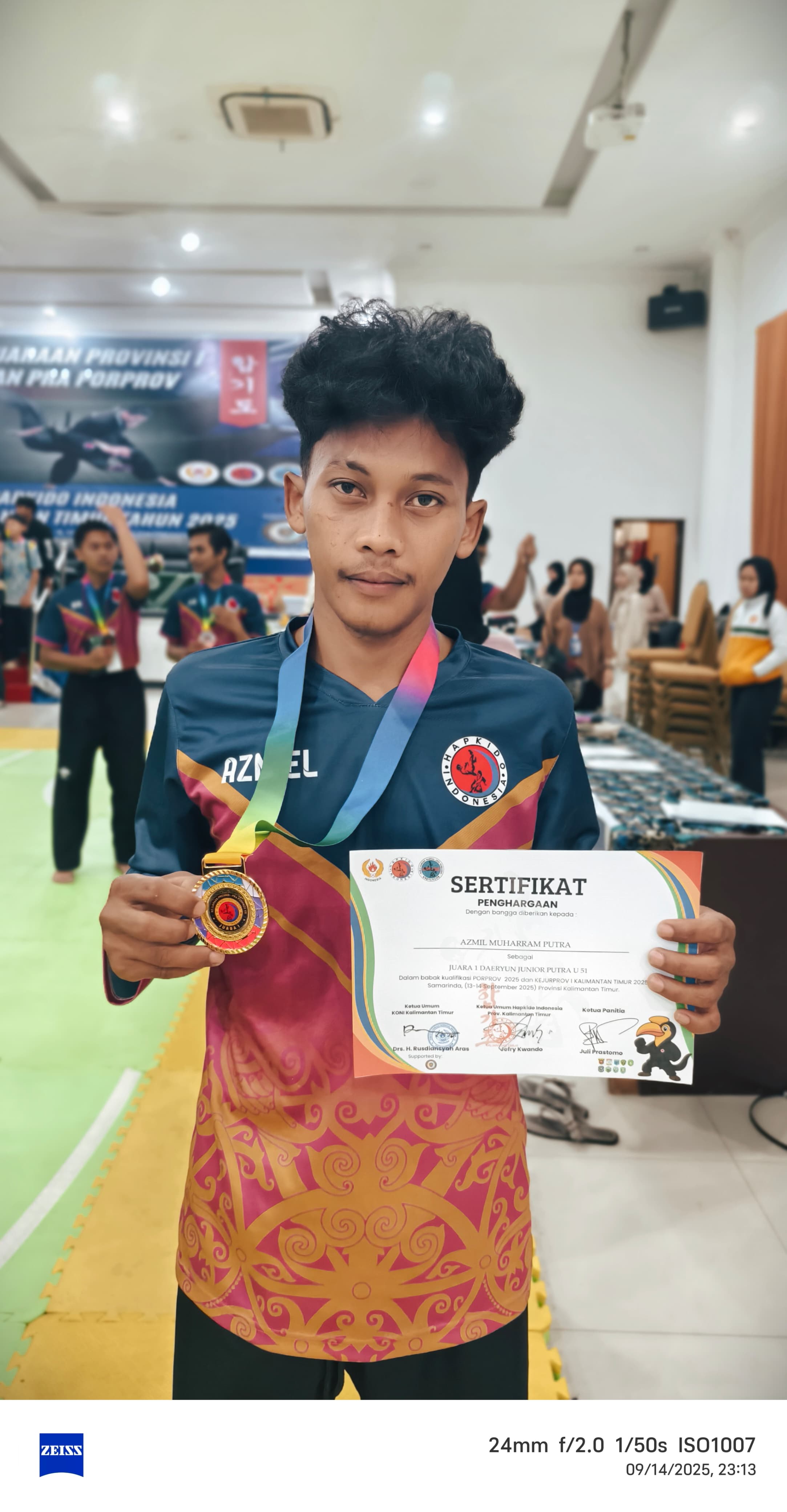 Selamat kepada Azmil Muharram Huda, Mahasiswa Prodi Pendidikan Olahraga (Angkatan 2023), atas prestasinya meraih Medali Emas Cabang Olahraga Hapkido kelas Daeryun Junior Putra U 51 di Babak Kualifikasi Porpov 2025 & Kejurprov 1 Kaltim 2025. Kebanggaan untuk kita semua!