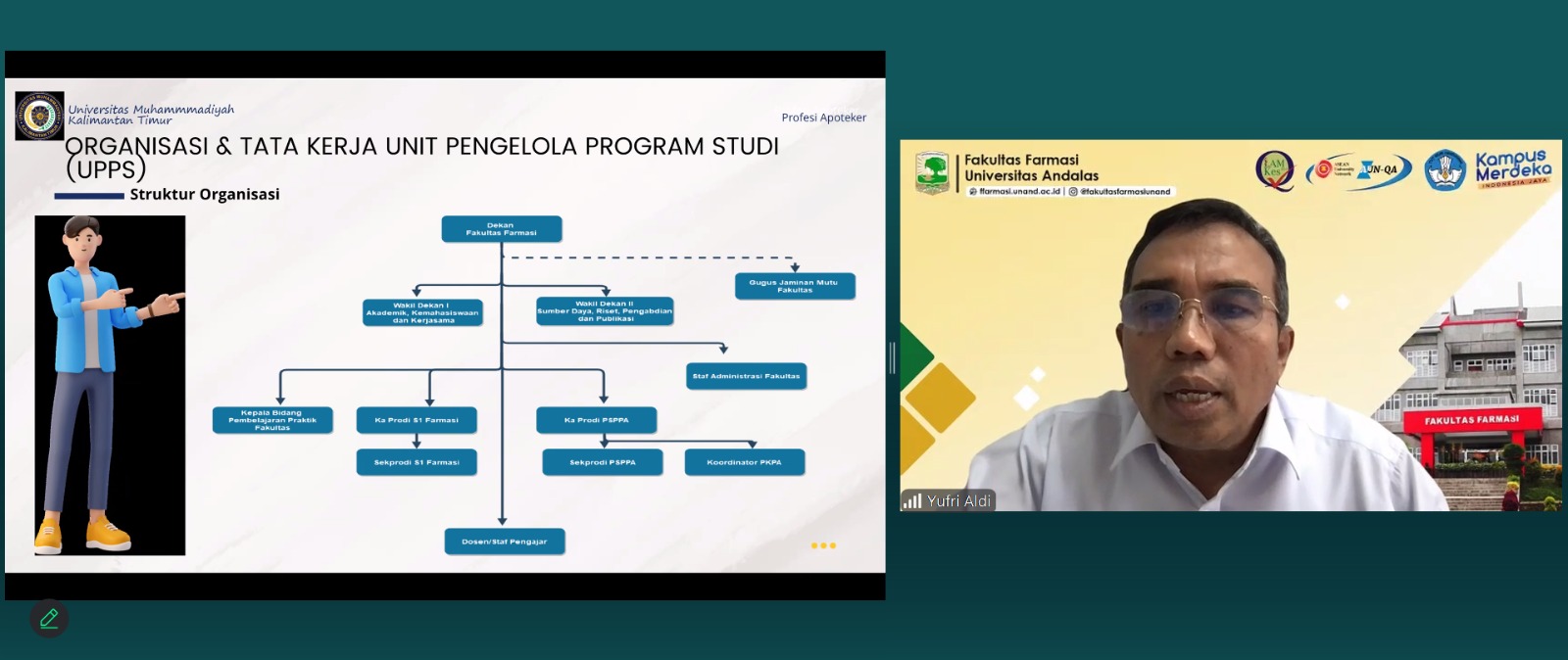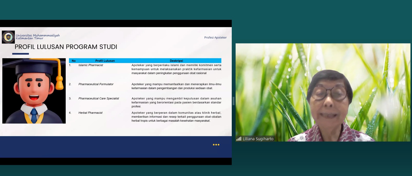 SAMARINDA - Universitas Muhammadiyah Kalimantan Timur (UMKT) berhasil menyelenggarakan kegiatan Evaluasi Lapangan Usul Pembukaan Program Studi Pendidikan Profesi Apoteker (PSPPA) secara daring pada Senin, 21 Juli 2025. Agenda ini menghadirkan Prof. Dr Apt Drs Yufri Aldi, M.Si. dan dr. Liliana Sugiharto, M.S., PA(K) selaku Tim Asesor dengan dipandu oleh Direktorat Kelembagaan Kementerian Pendidikan Tinggi, Sains, dan Teknologi (Kemendiktisaintek).