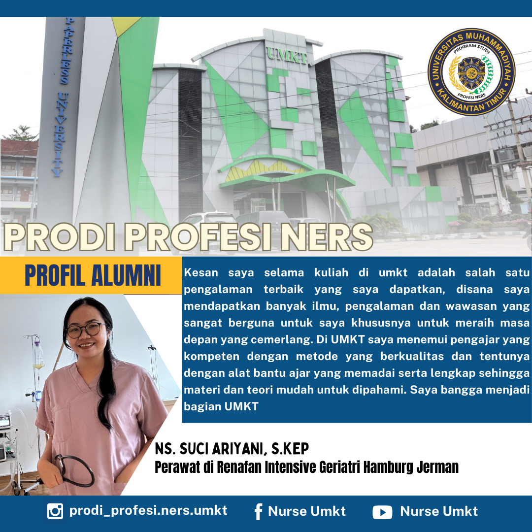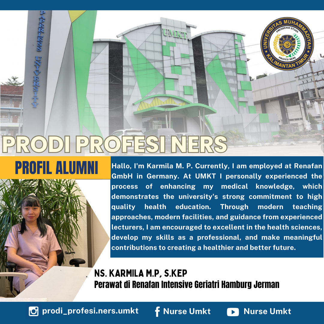 Berita Membanggakan datang dari negara jerman dimana Alumni Prodi Profesi Ners UMKT berhasil berkerja di fasilitas kesehatan negara jerman, hal ini tidak lepas dari peran program studi yang senantiasa memberikan informasi peluang kerja bagi para lulusan UMKT, ada 3 orang lulusan Prodi Profesi Ners UMKT yang bekerja di jerman, mereka merasa senang karena ilmu yang mereka peroleh selama masa kuliah dapat mengantarkan mereka hingga seperti sekarang ini, mari kita lihat testimoni para alumni yang bekerjan di jerman melalui poster berikut ini