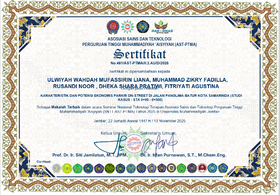 Prestasi tersebut diraih melalui karya ilmiah berjudul “Karakteristik dan Potensi Ekonomi Parkir On Street pada Jalan Panglima Batur Kota Samarinda” yang berhasil memperoleh predikat Terbaik 2 pada kategori Teknik Sipil, Planologi & Arsitektur, serta Teknik Lingkungan. Penelitian ini mengkaji secara komprehensif kondisi parkir di kawasan perkotaan, khususnya pada ruas jalan strategis di Samarinda, serta menggali potensi ekonominya sebagai salah satu sumber pendapatan daerah.